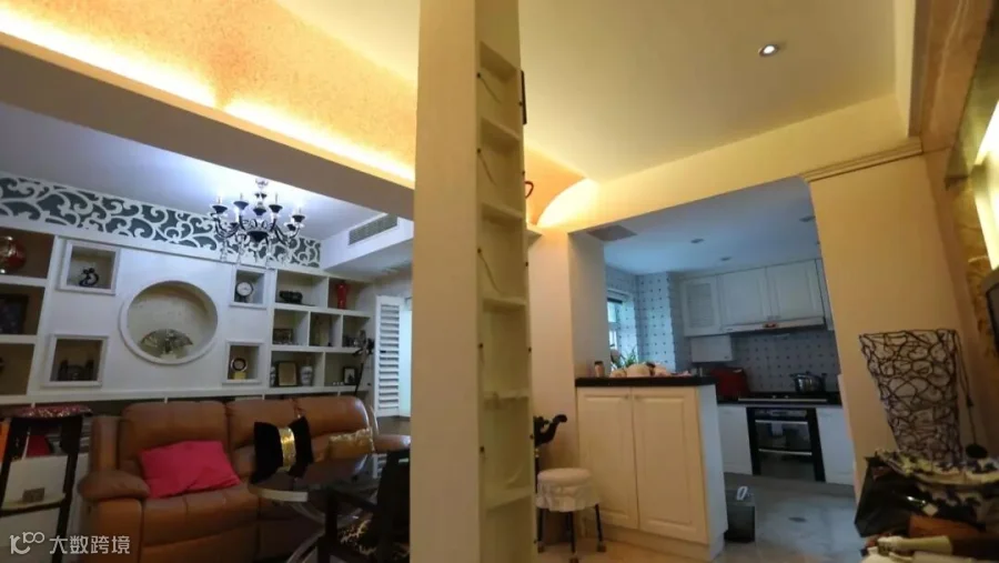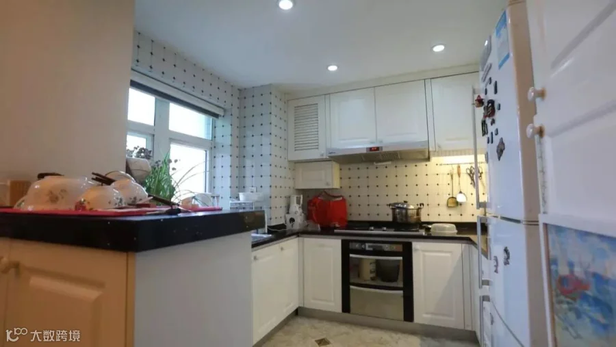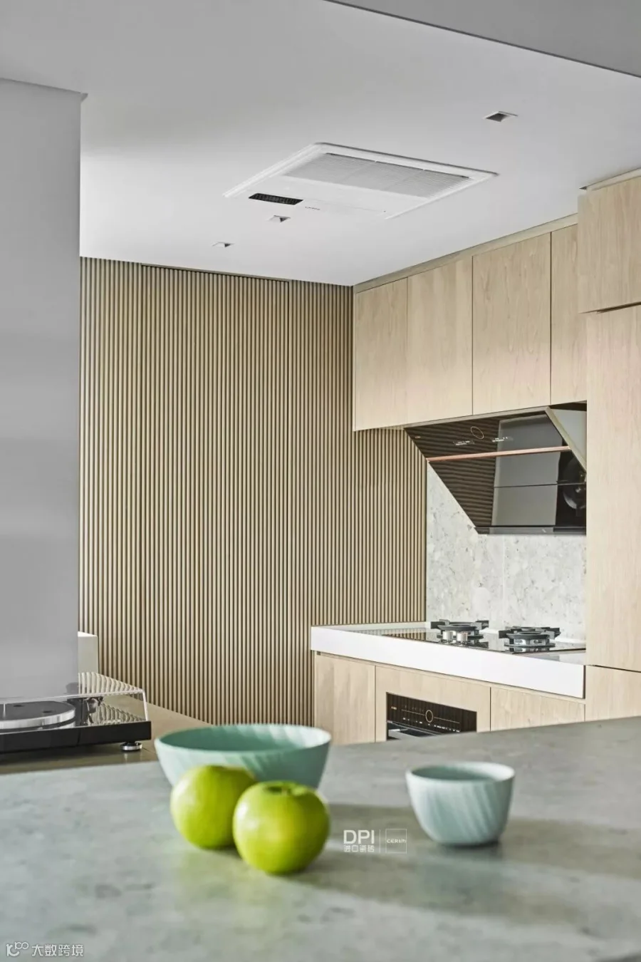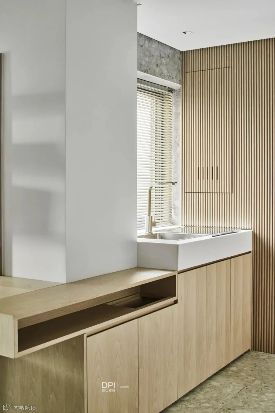 厨房区域经过重新梳理,在增加了卫生间的同时,将部分厨房功能外放至客厅的导台,使整个厨房的空间并没有因为面积的缩小而显得拥挤。