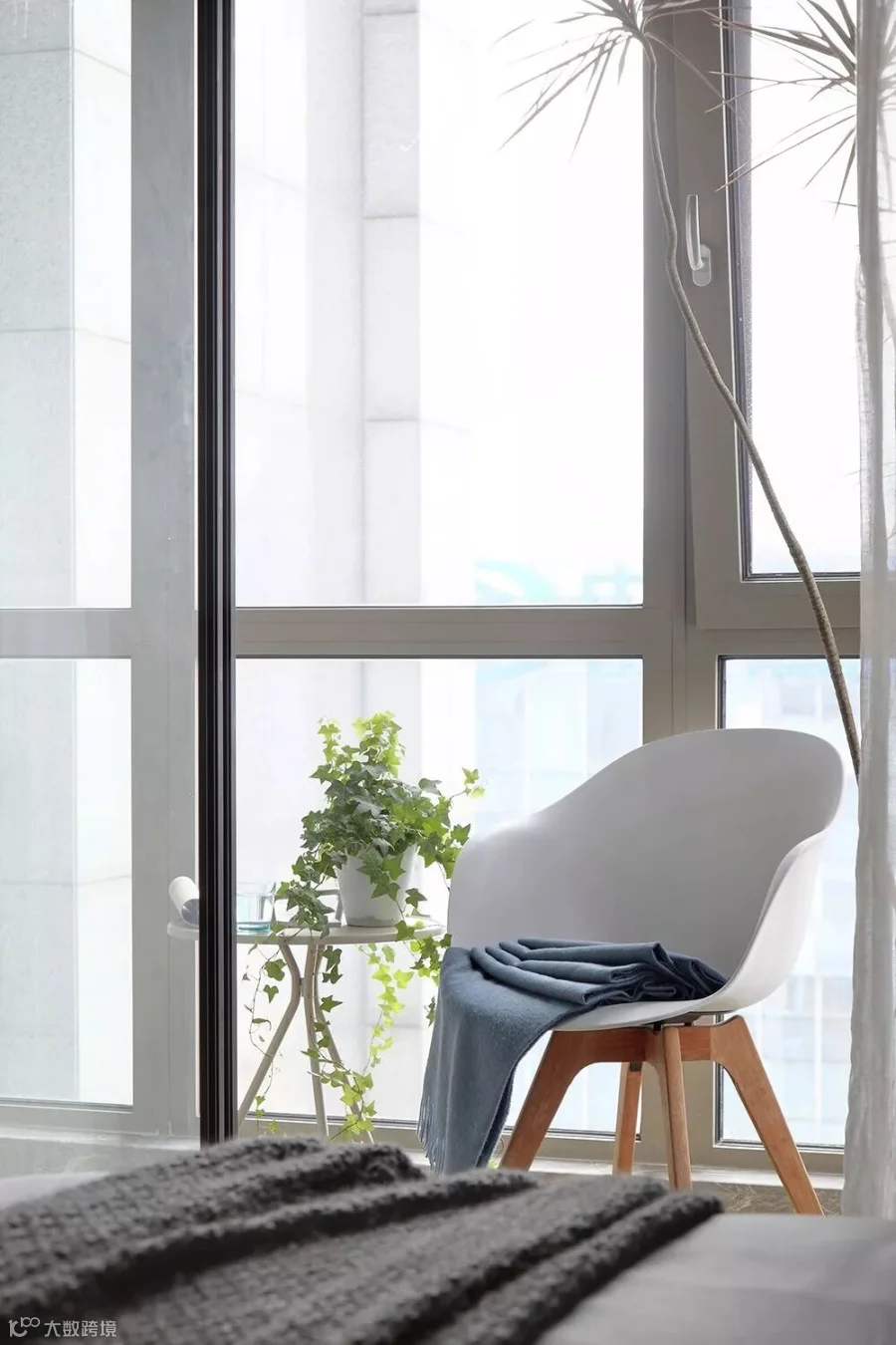 软饰在深浅不一的雅灰在空间中得以细腻布置,点缀以丝绒蓝靠枕,突出床品的质感与卧室的宜居属性。卧室邻接阳台,广纳清新自由空气。