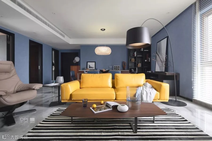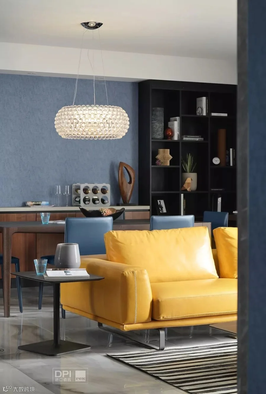 暮光蓝与樱草黄Tempo沙发的搭配,冷色调与暖色调的碰撞,述说着简练的造型语言,凝聚生活中每一段欢乐时光的瞬时光泽。灰色元素贯穿于整个空间,让室内层次更加丰富。