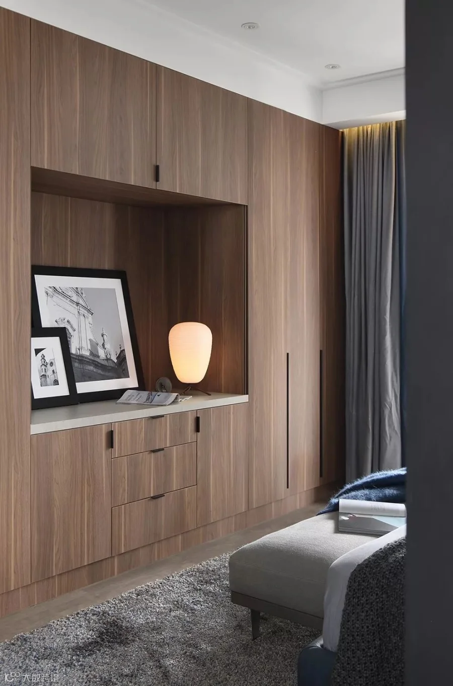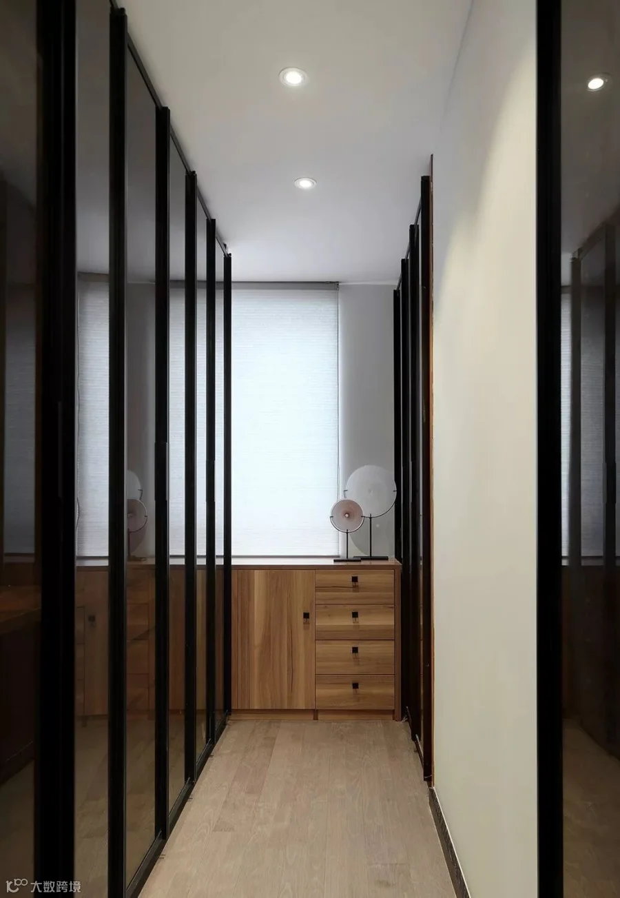 充满格调的衣帽间设计,尽显理性与感性的平衡之美,营造静谧、前卫、时尚的艺术气息,雅致的烟灰色玻璃柜门,不仅开阔空间视野,也方便日常搭配检视。