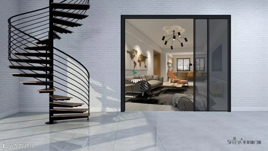 吊轨式推拉门的轨道被安装在墙体外的高处,门在打开时将会沿着轨道平行滑至一面的墙体上。