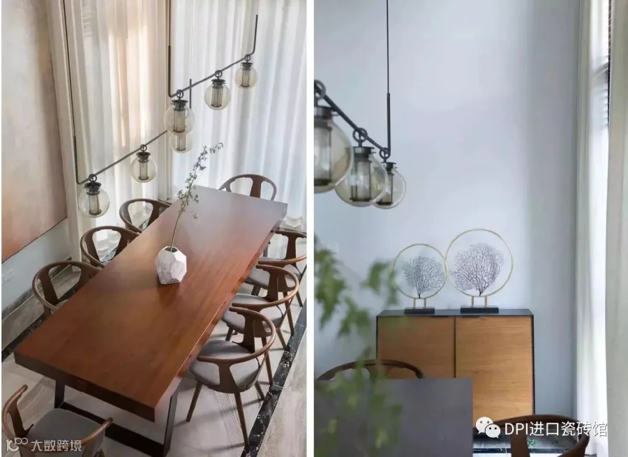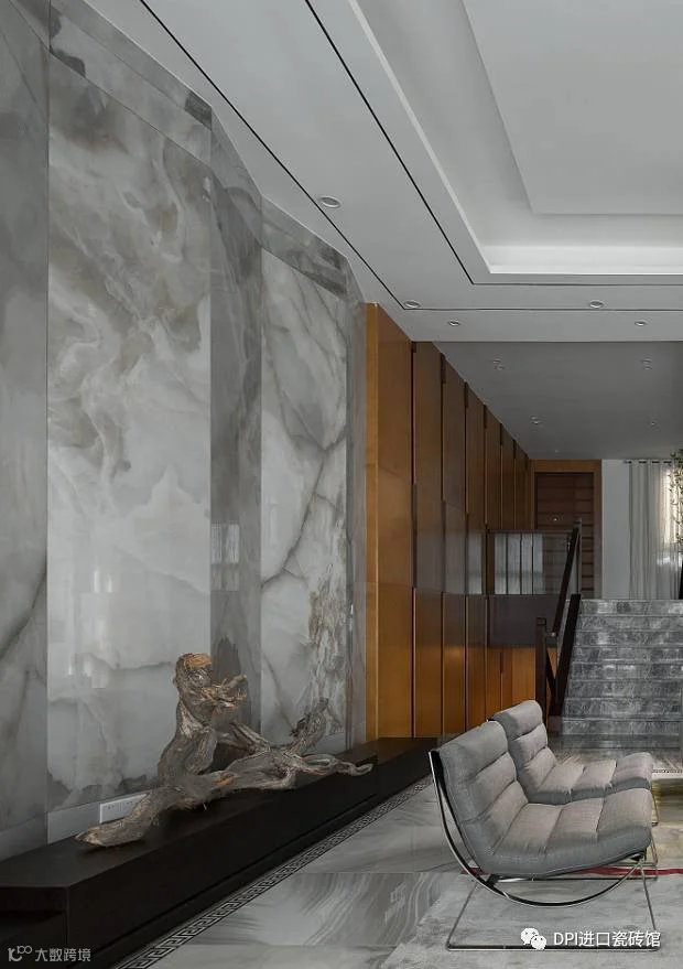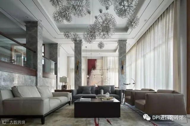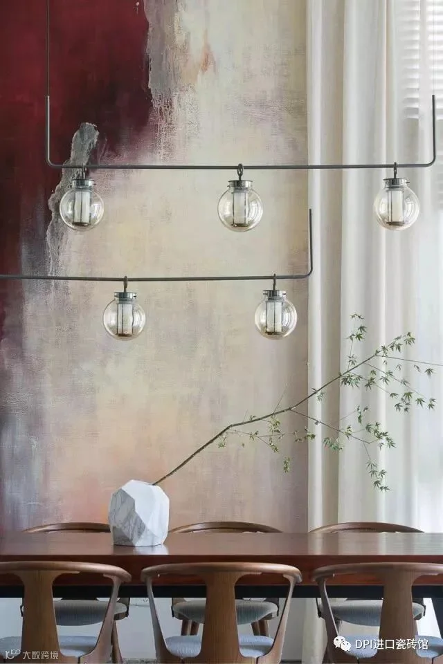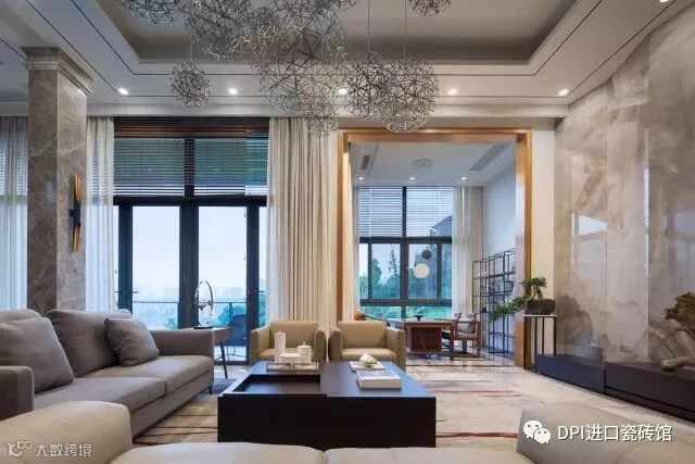 空间设计上,「江水」理所当然成为主要元素。地面墙面都用具有抽象图案的材料来表现这一主题。设计师在墙面局部合理运用与之尺度相配的超大尺寸薄片砖,其精彩的云纹与户外的江景互相呼应,营造出水天一色的效果;客厅做了一整面巨大的屏风状造型墙,使空间里氤氲着东方情韵;顶部则用19个大小不一的造型灯来丰富空间,夜晚点亮时,满室流光溢彩。