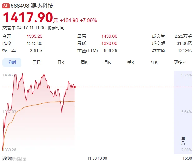 2026年4月17日早盘,A股上演历史性一幕——源杰科技(688498.SH)盘中最高股价1439元,正式超越贵州茅台(600519.SH),成为A股新“股王”。