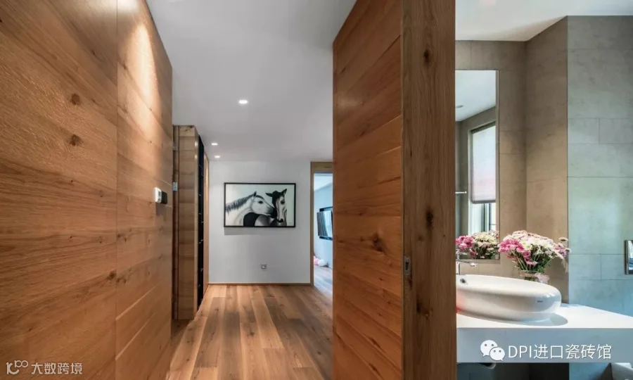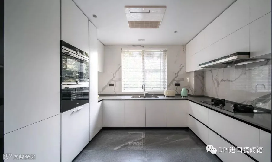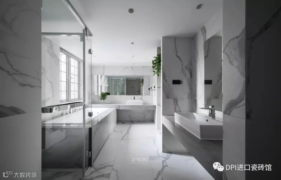 在厨房和卫生间区域采用了意大利锐思瓷砖特级雪花白,用纯净的白色,在光线映射下构筑一个专属而私密空间,源于自然,胜于自然。