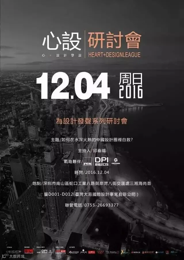 2016年12月4日,由DPI原装进口馆独家赞助的“心+设计学社”第四站研讨会在深圳举行,邱春瑞、孙建亚、杜柏均、曾传杰、赖建安、赖连取、颜呈勋、柯尚达、林琮然,9位心社“老男孩”亲临现场。本次活动还邀请到台湾首位德国红点至尊奖(金奖-best of the best)获得者、被台湾室内设计界誉为“台湾设计之光”的张清平来到现场,与老男孩们一齐为设计发声。