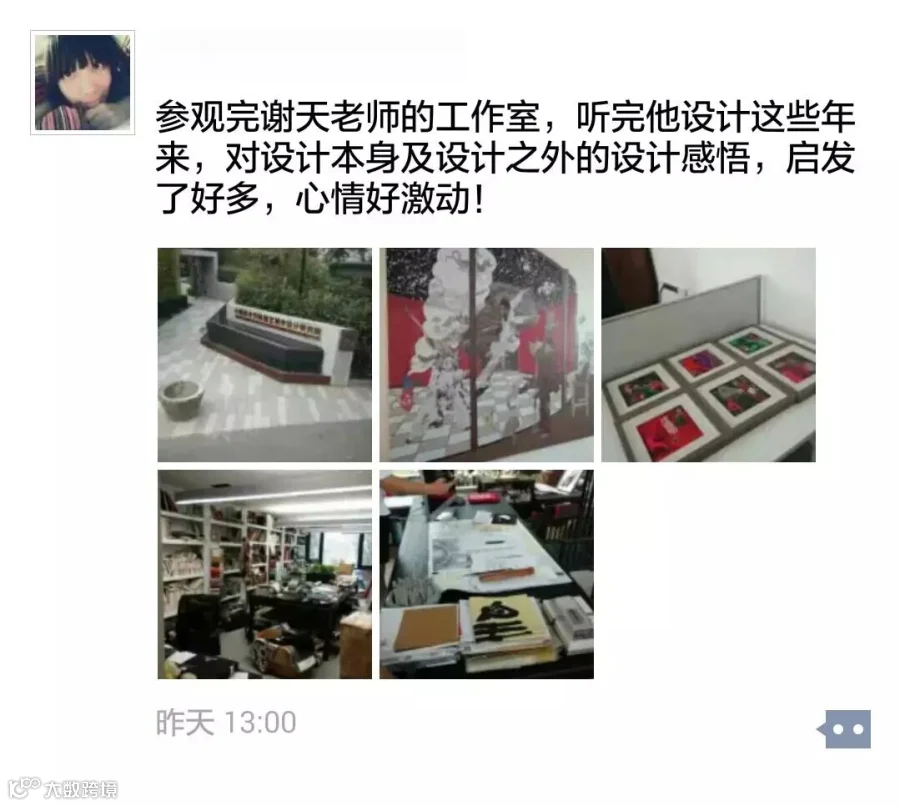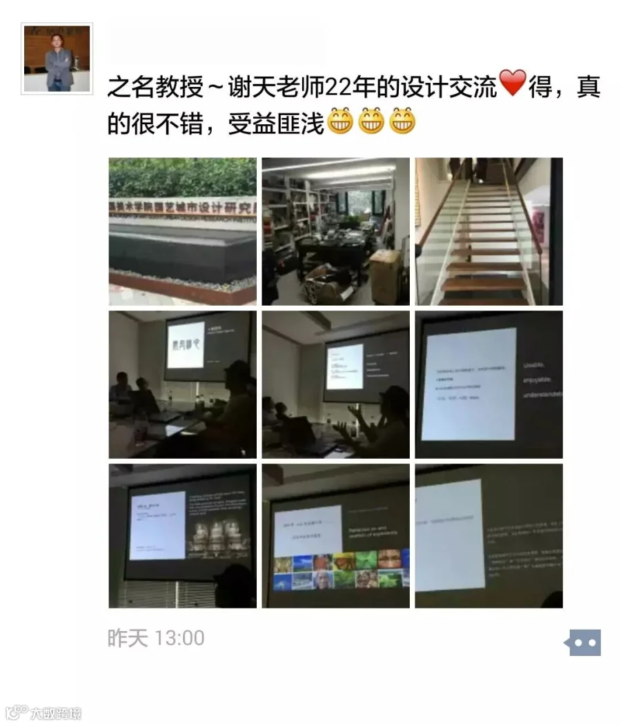13日上午,在位于中国美术学院国艺城市设计研究院的谢天老师工作室内,谢天老师向队友们分享了22年从业所感悟的“心造空间”理念,阐释了空间“可用、可赏、可悟”三个不同的层面。此外,谢天老师还分享了自己22年来从生存方式到思考方式、从思考方式到生活方式三个不同阶段的设计人生历程。对于队友提出“如何可以快速地成为一个优秀的设计师”的问题,谢天老师表示唯有“勤奋”,只有比其他人付出更多的时间和精力,才会比别人成长地更快。
