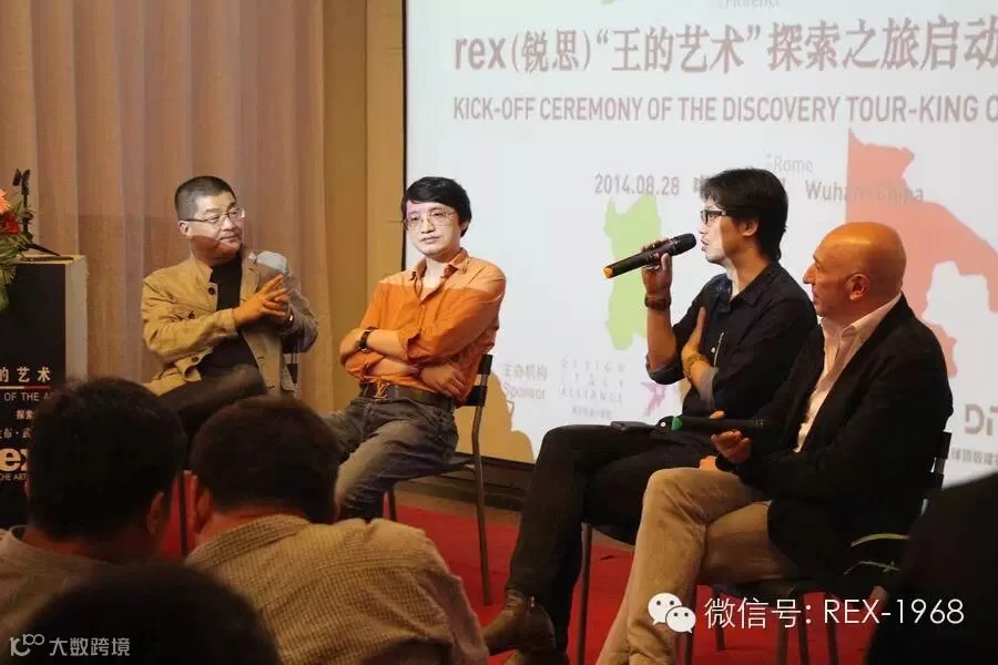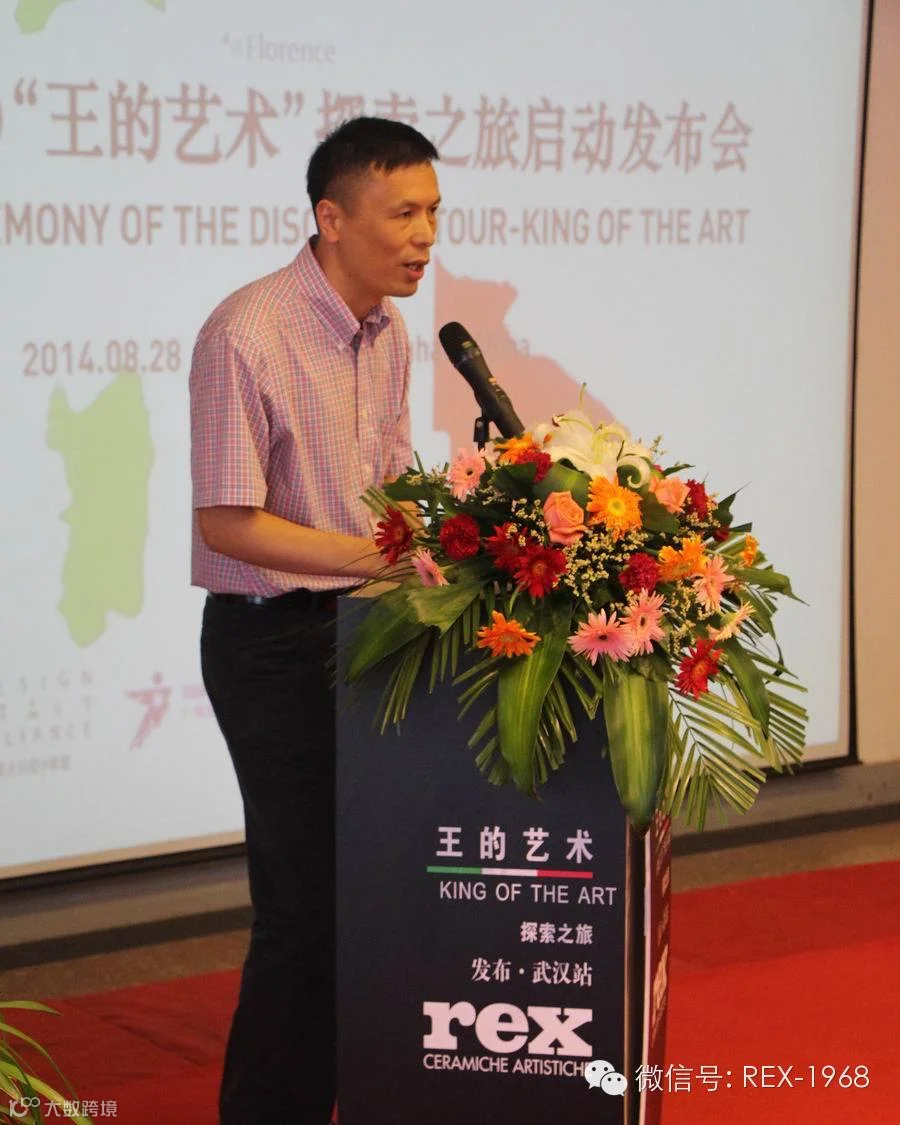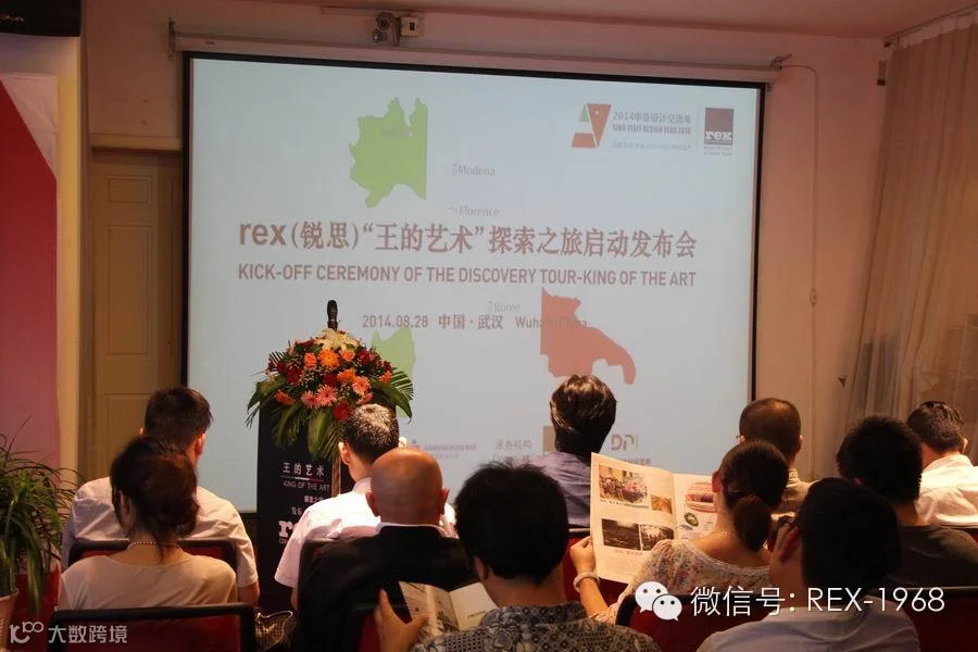 2014年8月28日14:30,2014中意设计交流年系列活动——“rex‘王的艺术’探索之旅武汉站启动仪式”在湖北省美术院美术馆举行。湖北省装饰协会会长李杰先生,国际室内建筑师/设计师团体联盟(IFI)增选常务委员、广州国际设计周执行总监张宏毅先生,广东东鹏控股股份有限公司DPI-REX中心总经理张升华先生,中国室内装饰协会武汉分会会长朱回瀚先生,副会长陈彬先生,中国室内装饰协会武汉分会秘书长刘威先生,北省工商联执委、湖北省广东商会执行会长、武汉市恒辉建材有限责任公司董事长岑文辉先生,以及武汉数十名设计师精英朋友共聚一堂,共同探讨“王的艺术”。
