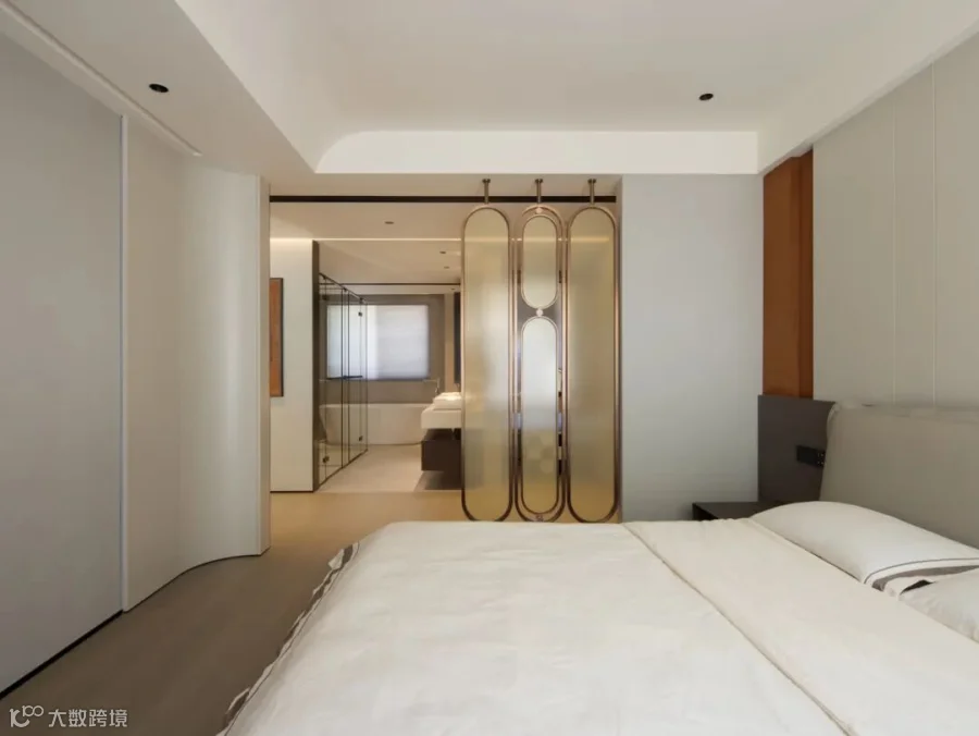 卧室的墙面以柔和的弧线弱化了转角的生硬感,床头背景墙与壁画的色彩相互呼应。主卧采用开放式设计,通过玻璃隔断将卧室与梳妆台、洗手台巧妙分隔,营造出空间的通透感和灵活的动线。