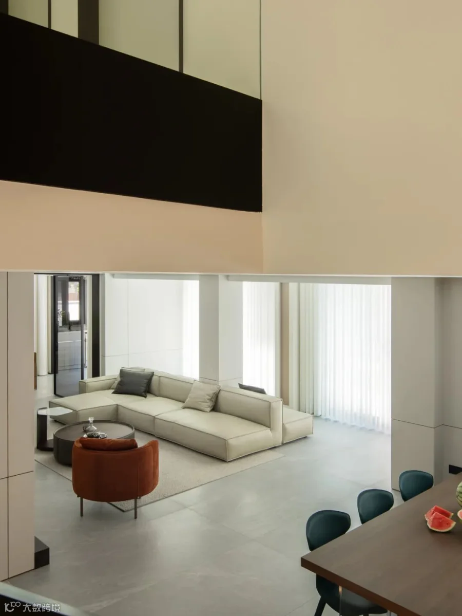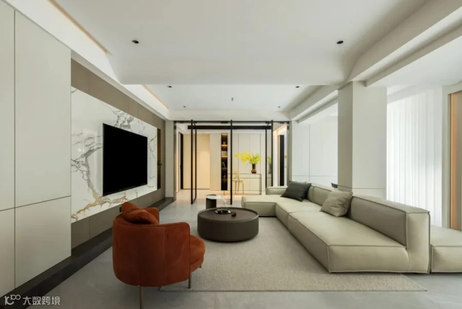 无主灯大横厅布局灵活,彰显出空间的宽敞与通透。针对既定的承重结构,巧妙运用了双靠背沙发,以柔和的姿态减弱了它们的视觉焦点。一侧朝向庭院,极大地提升了室内的采光与通风效果,视野更加开阔。