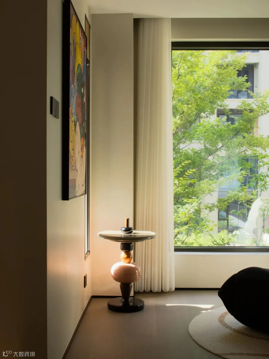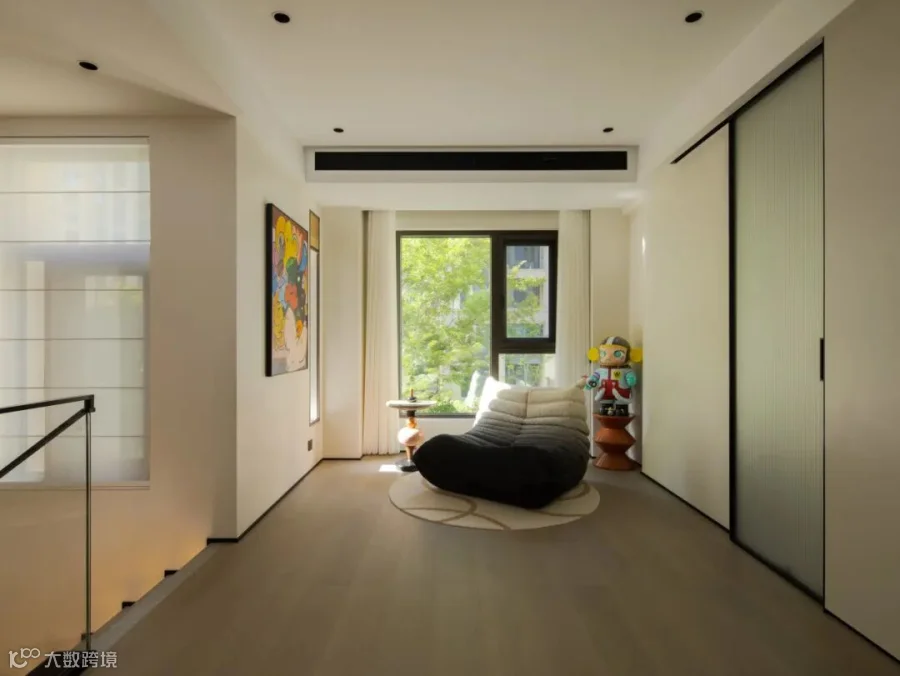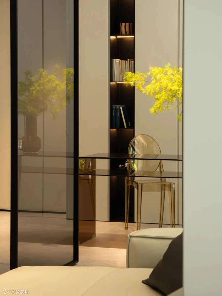 利用玻璃中轴旋转门作为书房与客厅的界标,既模糊了空间界限的生硬感,又丰富了空间的视觉层次,不仅确保了书房的私密性不受侵扰,同时也赋予了空间以通透的特质,让光线能够自由地穿梭其间,为整个空间带来温暖与活力。