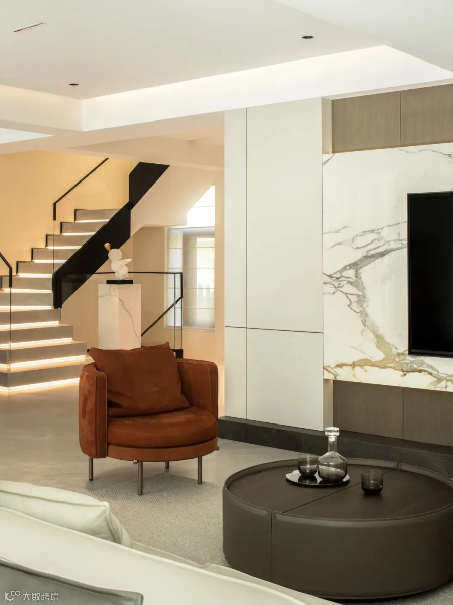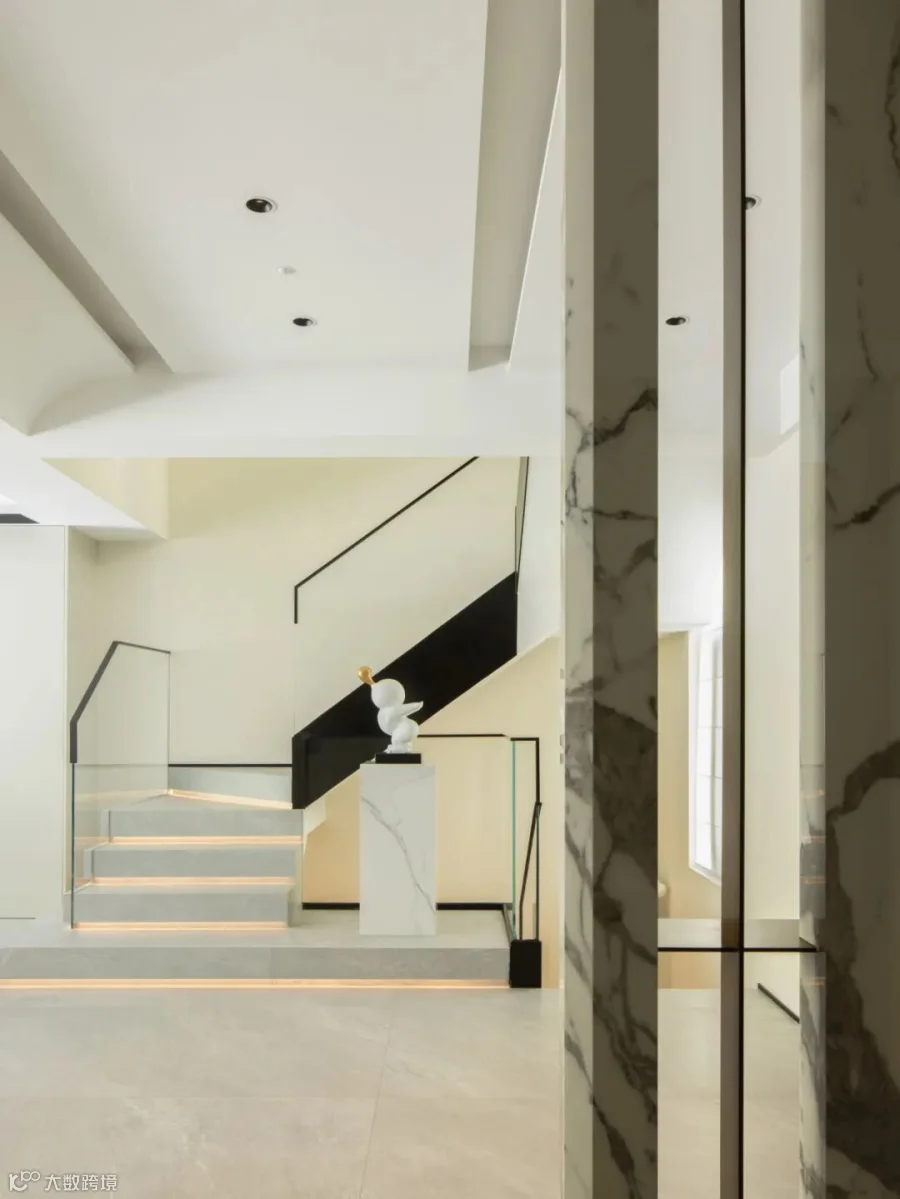 打破了传统的直线设计,叠式楼梯与玻璃栏杆的结合,让视觉上更开阔、透亮,错落有致的空间层次,灵动感呼之欲出;与之搭配了一件雕塑装饰品,以其颇具现代感的造型纵向深入设计,为空间创造出了一个引人注目的视觉焦点;楼梯底部巧妙地设置了隐藏式照明,不仅为上下楼梯提供了必要的光线,还营造出一种温馨和浪漫的氛围。每当夜幕降临,灯光亮起,整个楼梯仿佛化身为一件璀璨的艺术品,美轮美奂。