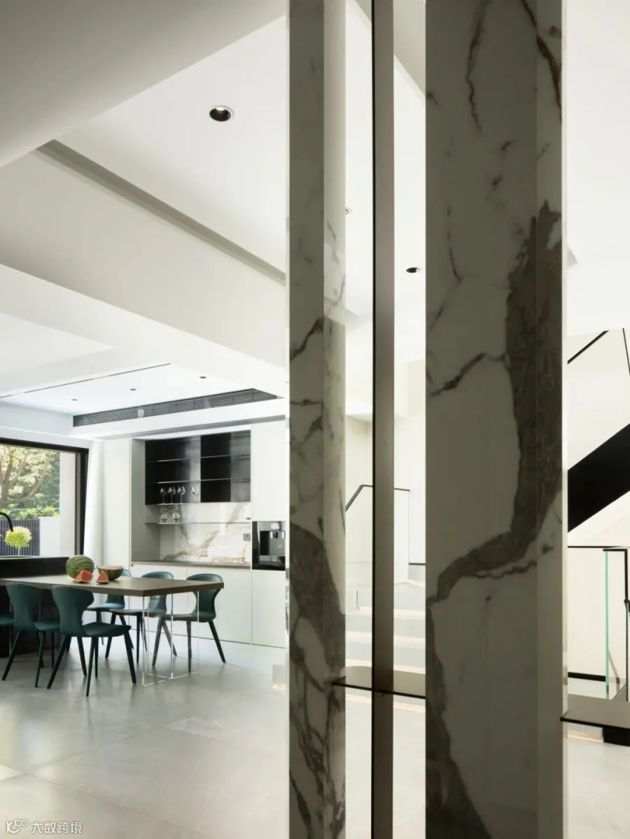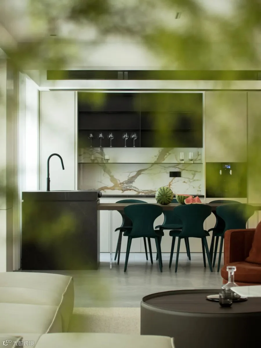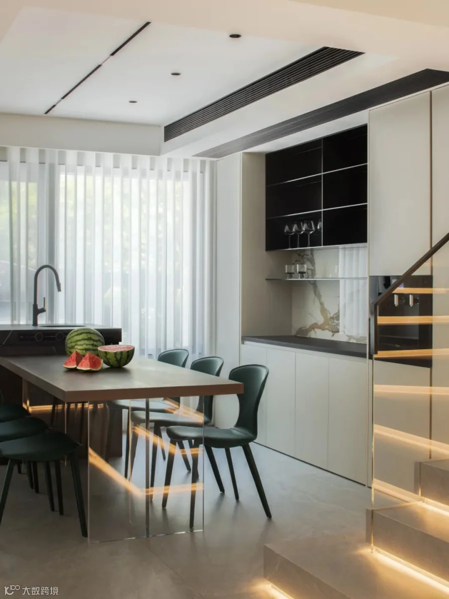 客厅、西厨水吧与餐厅的整合设计,使得整个空间流畅而开阔。瓷砖的通铺手法,不仅增强了空间的视觉延伸感,还营造出一种清爽不杂乱的氛围。玄关背景墙与餐桌岛台,均选用了进口岩板,并经过深加工处理,既保留了岩板的自然美感,又赋予了空间独特的艺术气息。