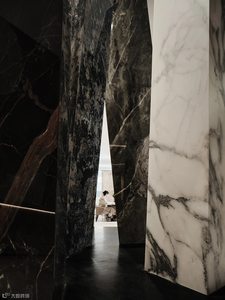 展厅集产品展示、日常办公以及休闲洽谈于一体,设计师注重空间的⽐例均衡和形式美。并利用功能区块之间的迂回,做出合理的观赏动线,让工作人员和顾客之间的洽谈轻松自如。中厅区域,设计师借助原有的柱子做出回形动线,形成空间的视觉互通,让身处其中的人产生互相对望的有趣体验。
