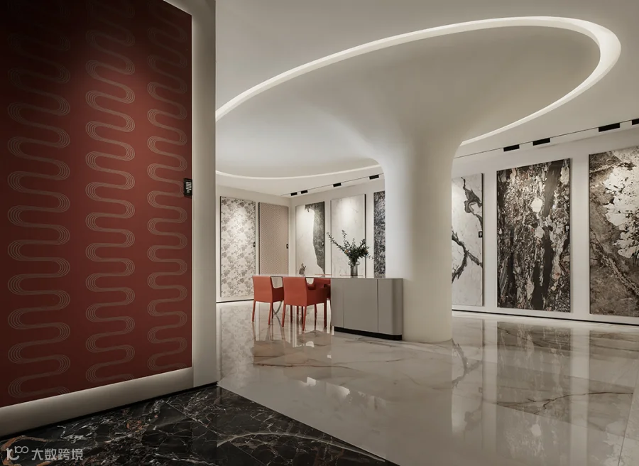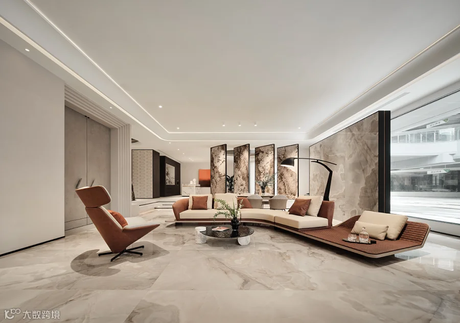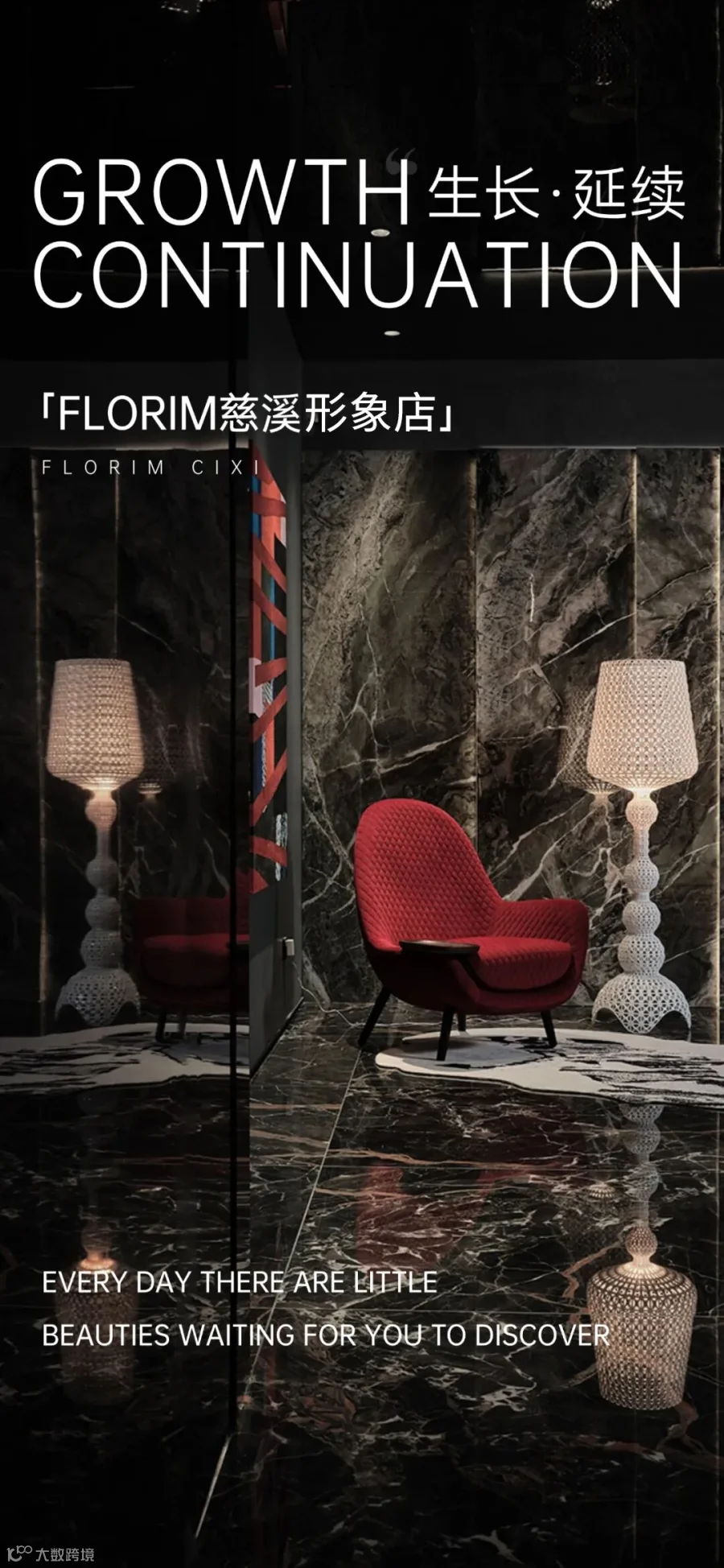 本案是位于宁波慈溪的FLORIM品牌形象店。作为全球瓷砖领域的领航者,FLORIM拥有近62年的品牌基因,产品以奢华、当代、创意、建筑等四大设计特质彰显独有的美学张力。本案设计师遵循FLORIM品牌的精神内核,以人为本,关注客户对产品的审美愉悦和感官享受,构建精致且充满幸福感的体验空间。