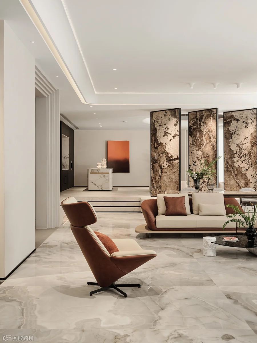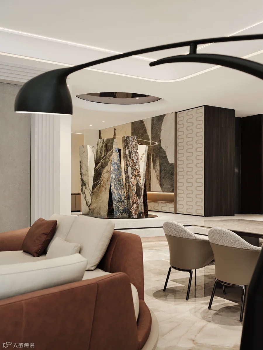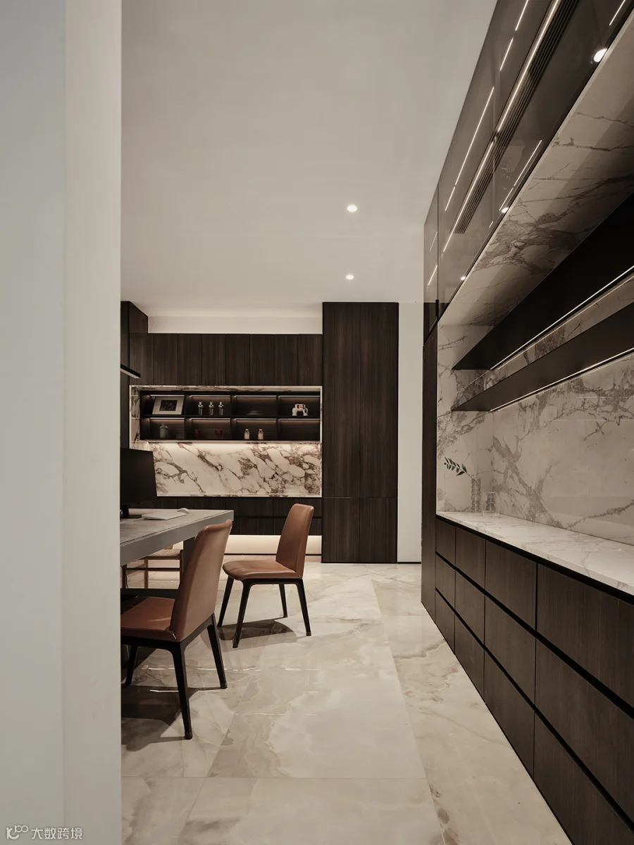 LDK空间是展厅的重点,作为家宅中运用瓷砖和岩板最广的区域,设计师以情景演绎的手法,将材质、家具、灯光融为一体,让顾客行至此处时更具有代入感。自由一旦扎根,就会像植物一样迅速生长,客餐厅一体的流畅设计,意式轻奢的浓厚氛围,让人不由心生眷恋,徜徉在这个温暖而高级的环抱中。