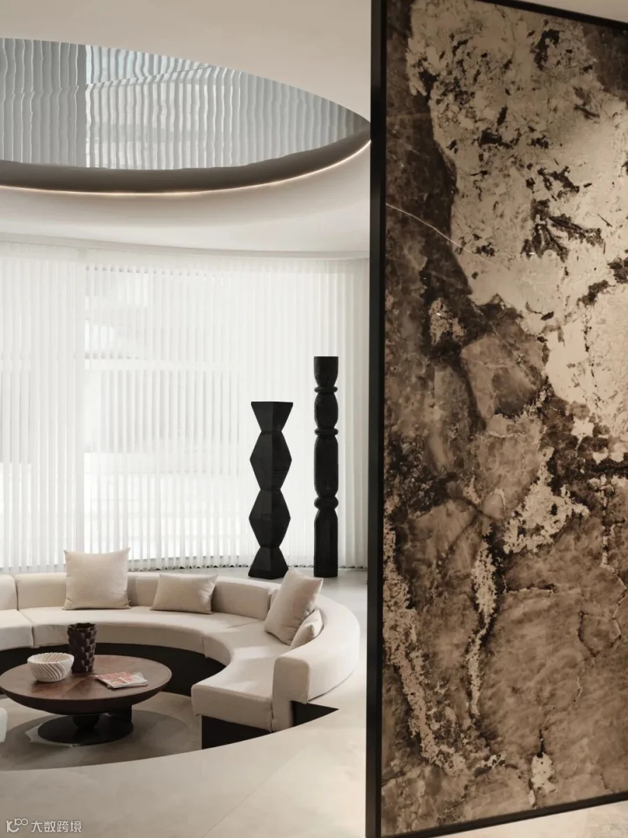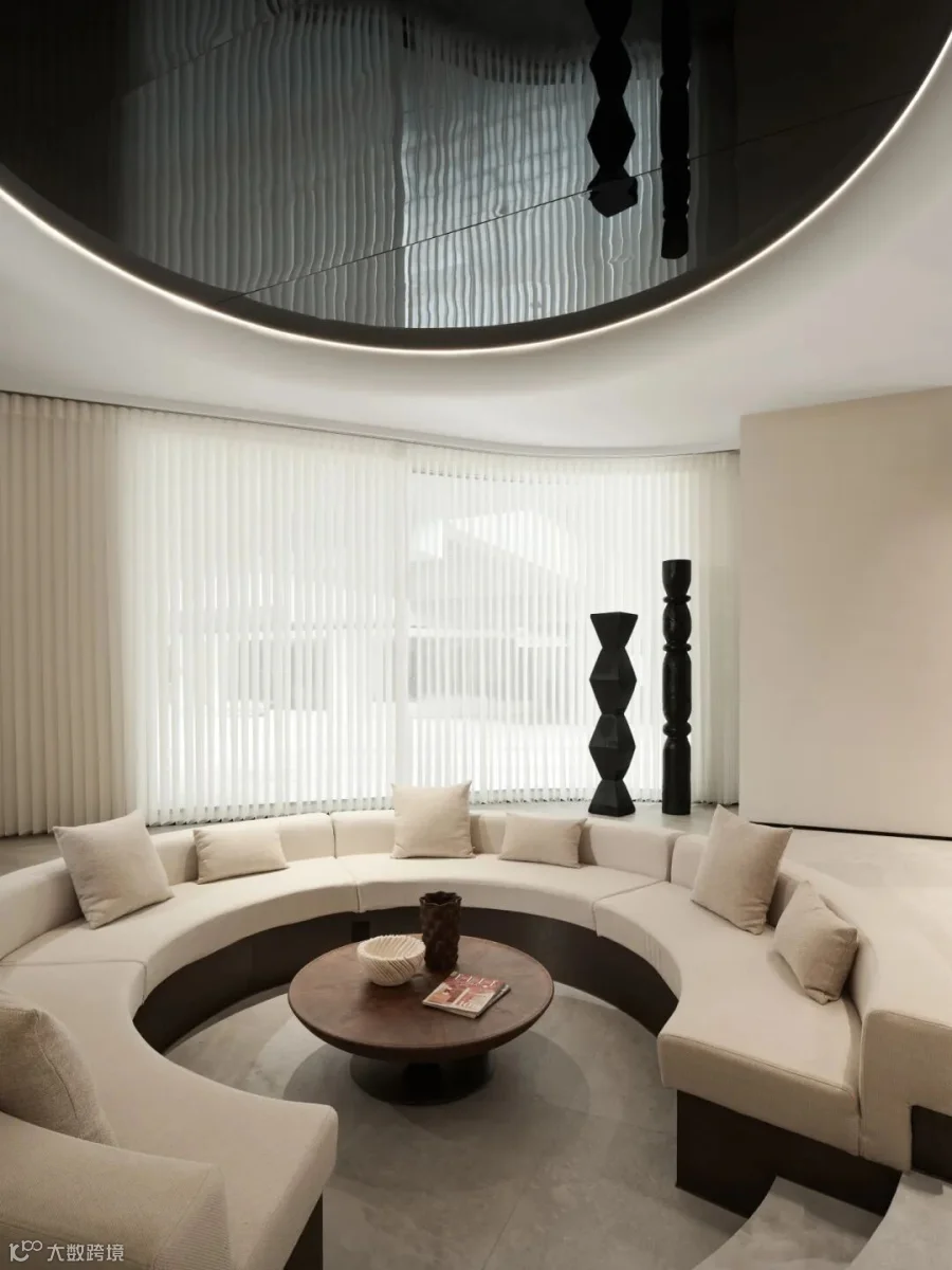 在展厅的一角设有客户的休闲区。设计师用下沉式手法做出区域的立体造型,乳白的沙发搭梦幻窗帘,呈现家宅的地下会客厅或者是休闲厅的使用情景,自在的松弛感慢慢生长和蔓延,给客人宾至如归的体验感。