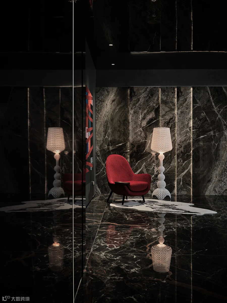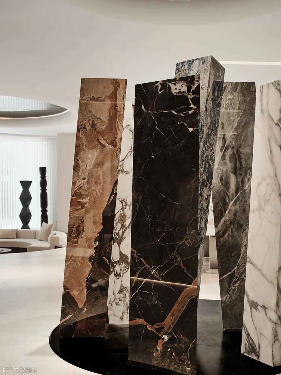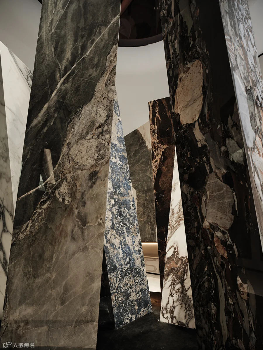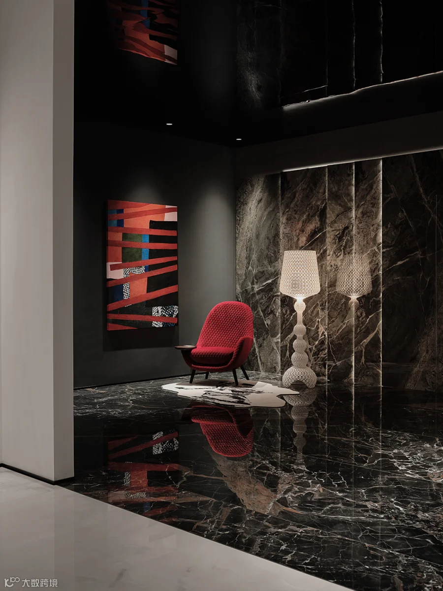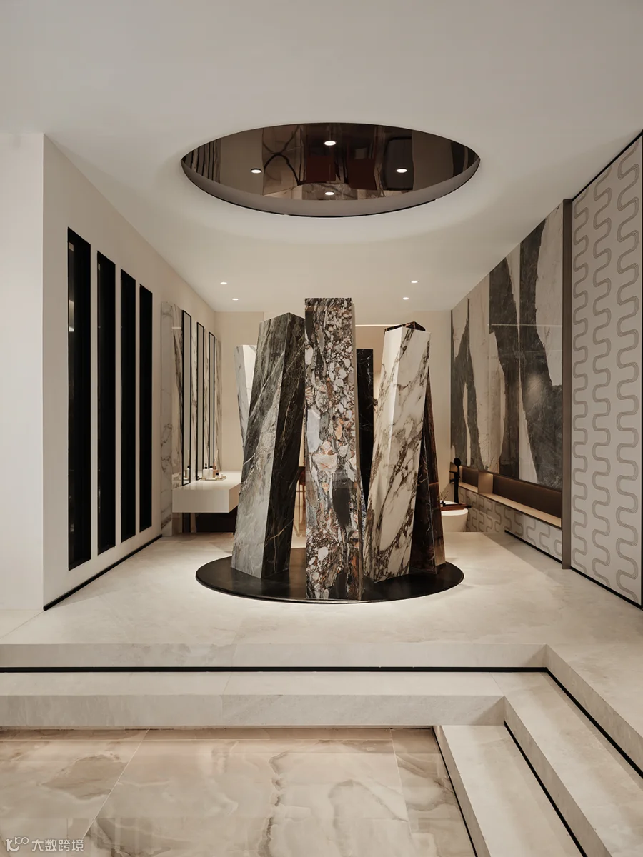 【王的艺术】代表一种基于王对荣誉、自信、品味、生活态度,来源击破泥土向上生长生命力。几块大规格纹理的瓷砖以不同的角度聚拢放置,震撼大气、气势恢弘,极富视觉冲击力。顶面的镜面倒影,寓意生命周而复始,生生不息。华丽的造型表现,彰显着空间非凡的艺术张力。