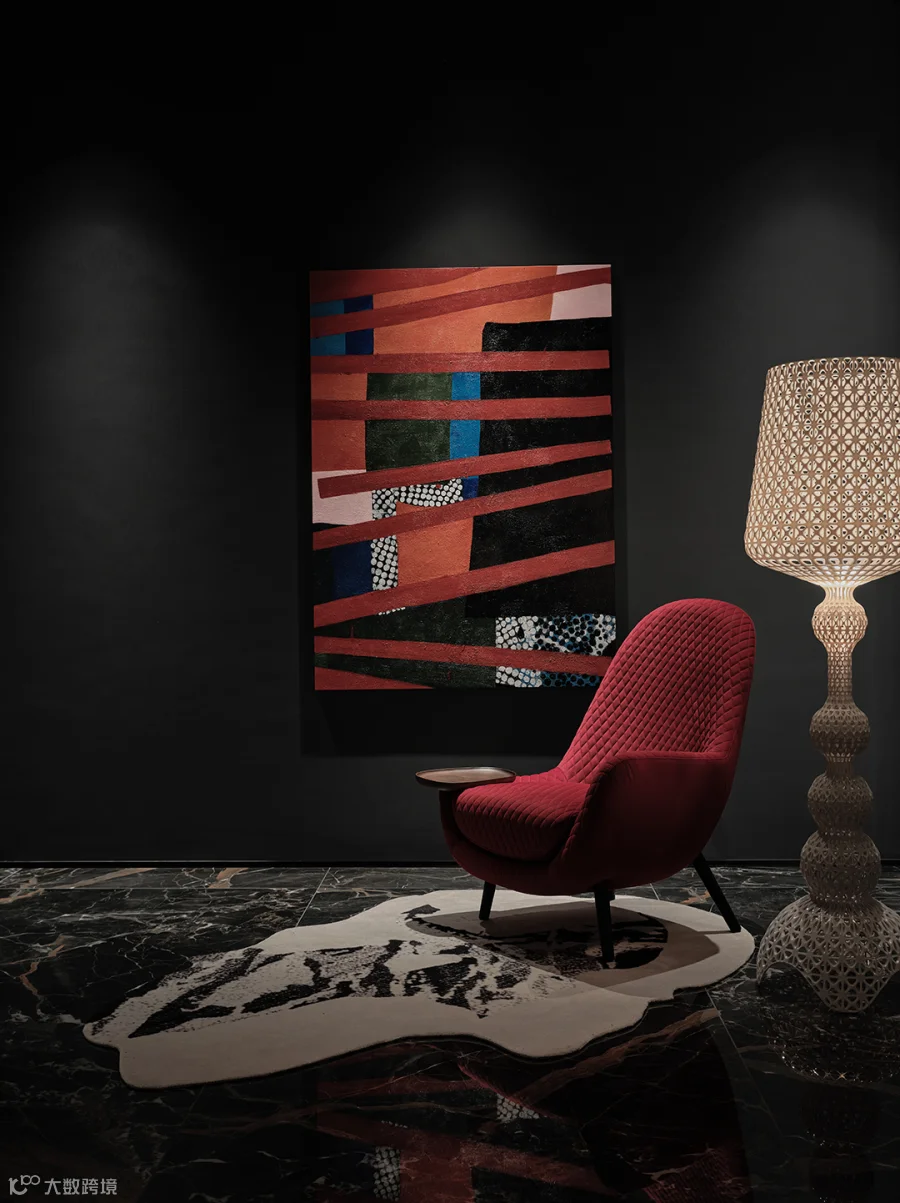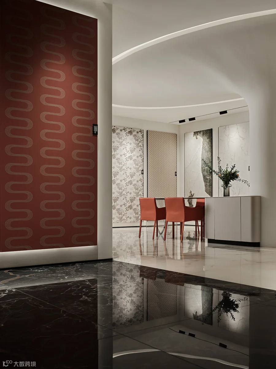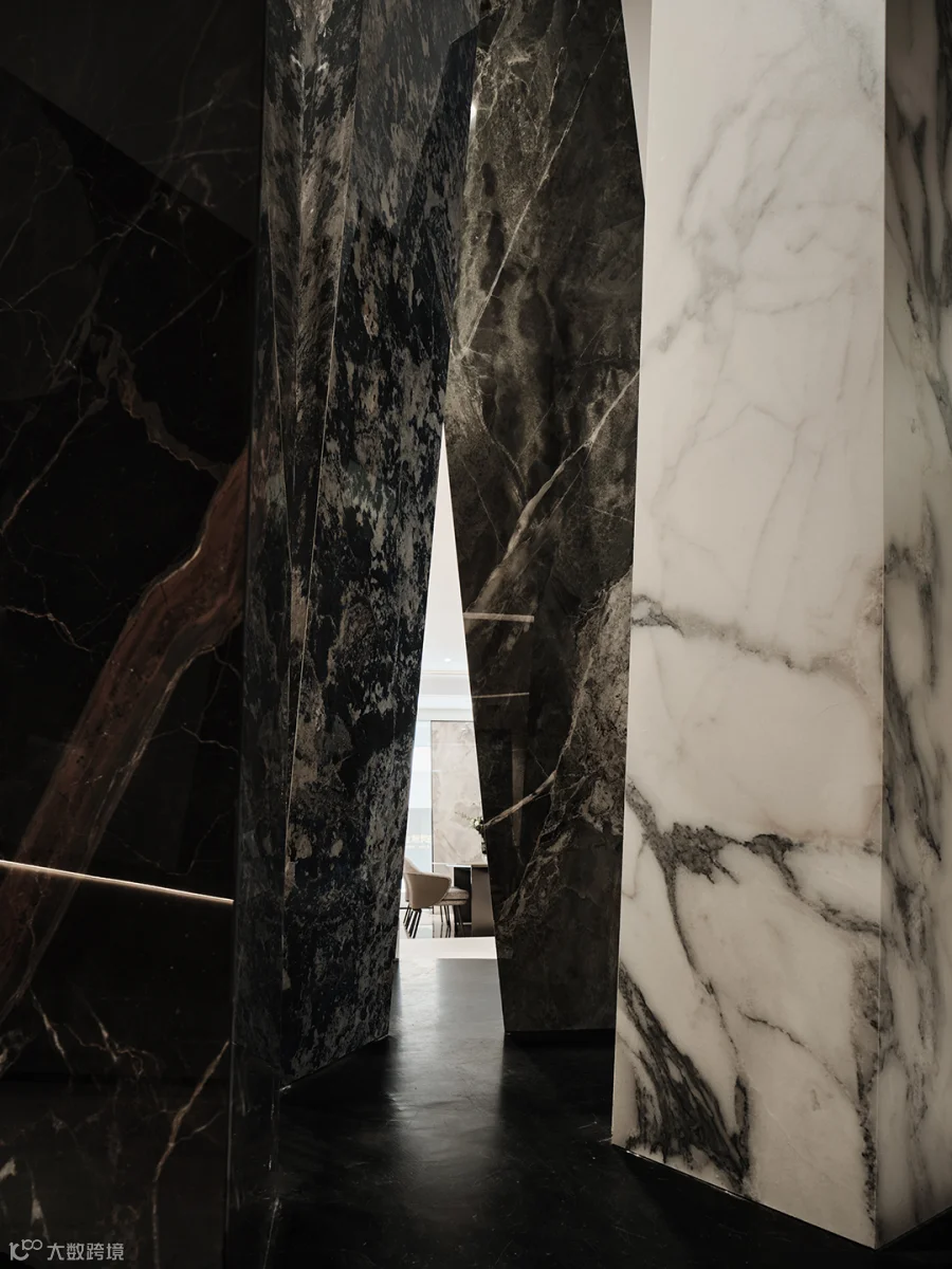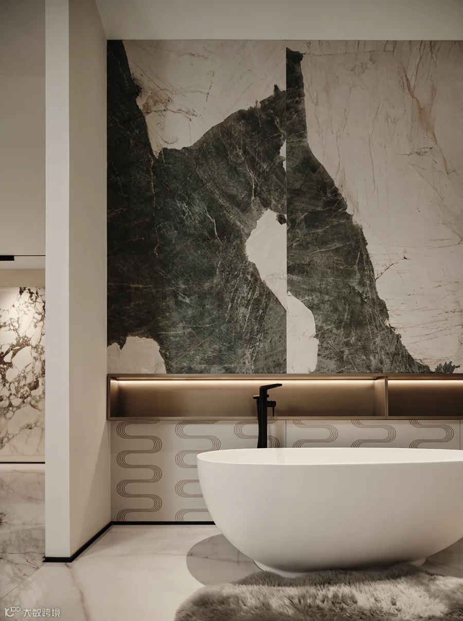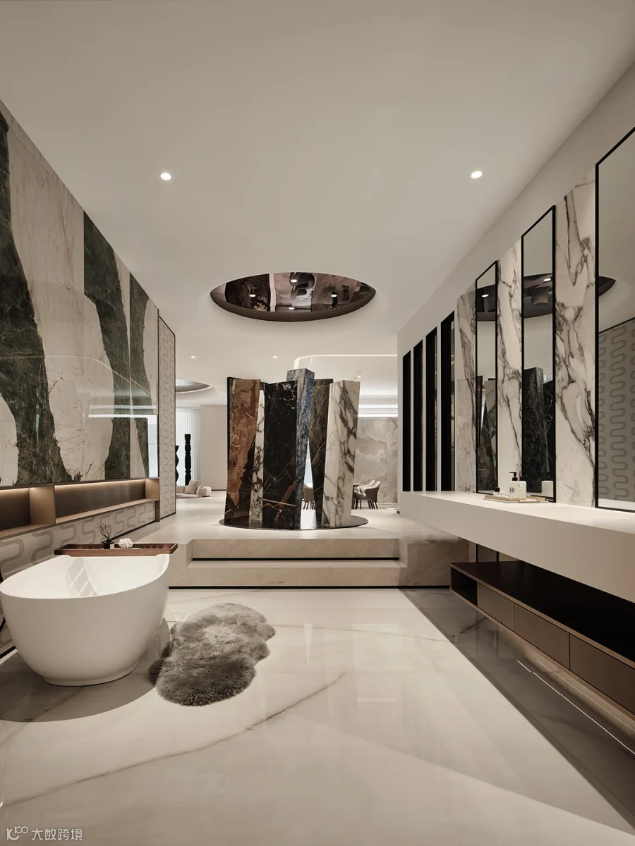 【王的艺术】代表一种基于王对荣誉、自信、品味、生活态度,来源击破泥土向上生长生命力。几块大规格纹理的瓷砖以不同的角度聚拢放置,震撼大气、气势恢弘,极富视觉冲击力。顶面的镜面倒影,寓意生命周而复始,生生不息。华丽的造型表现,彰显着空间非凡的艺术张力。