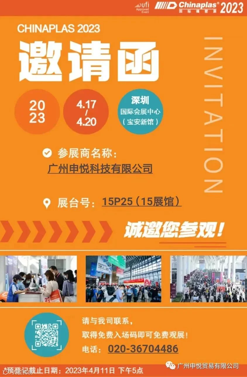 广州申悦科技有限公司与广州申悦贸易有限公司将于2023年4月17日至2023年4月20日参展CHINAPLAS 2023 国际橡塑展——第三十五届中国国际塑料橡胶工业展览会,届时我们公司同仁将在深圳国际会展中心15号展厅15P25 展台恭候您的驾临,与您共同分享最新的产品资讯与应用技术。现邀请您免费登记参观2023年深圳国际橡塑展。