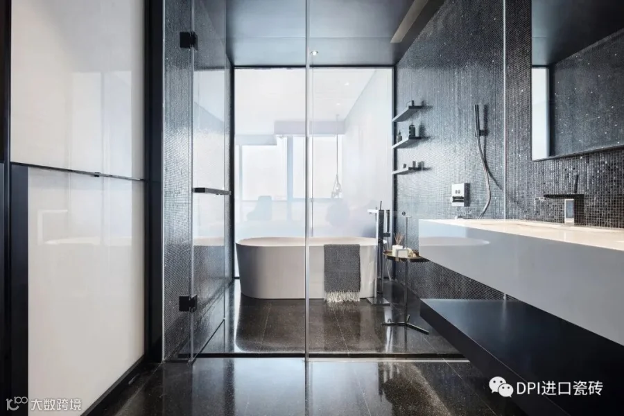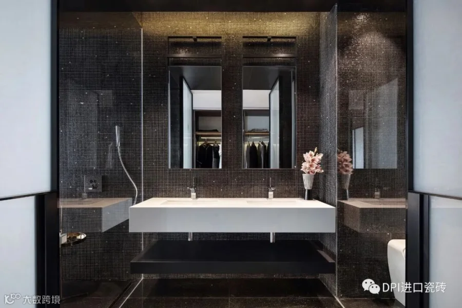 主卫使用深色马赛克铺呈,白色水晶零星点缀,营造出完美的纵深感,细节处透露个性与时尚基因。搭配悬浮式镜面、台盆以及置物架,整体效果非常简洁优雅。