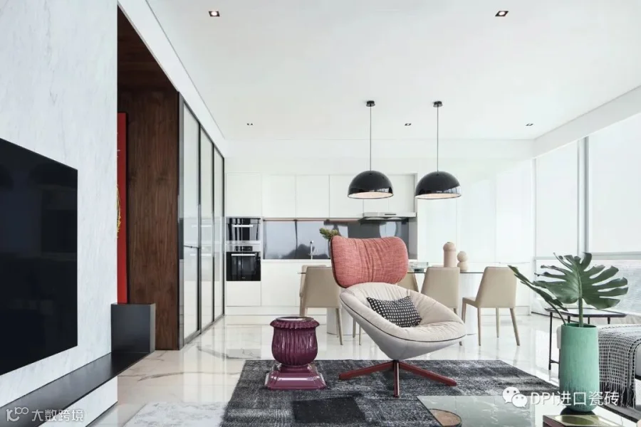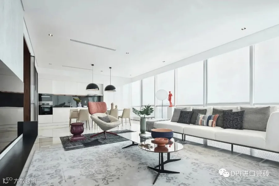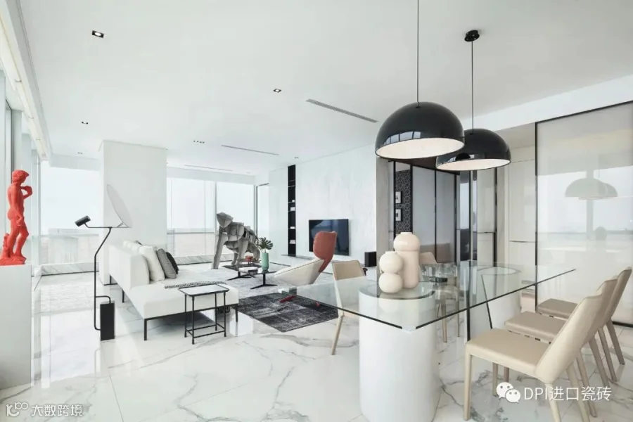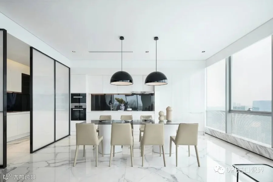 开放式客餐厅大面积采用意大利REX特级雪花白与玻璃、金属相搭,奢华与极简相结合,营造出一种华丽又不张扬的美感。两侧全尺度落地窗引入天然光感,简单纯粹之余,又塑造开阔画面。