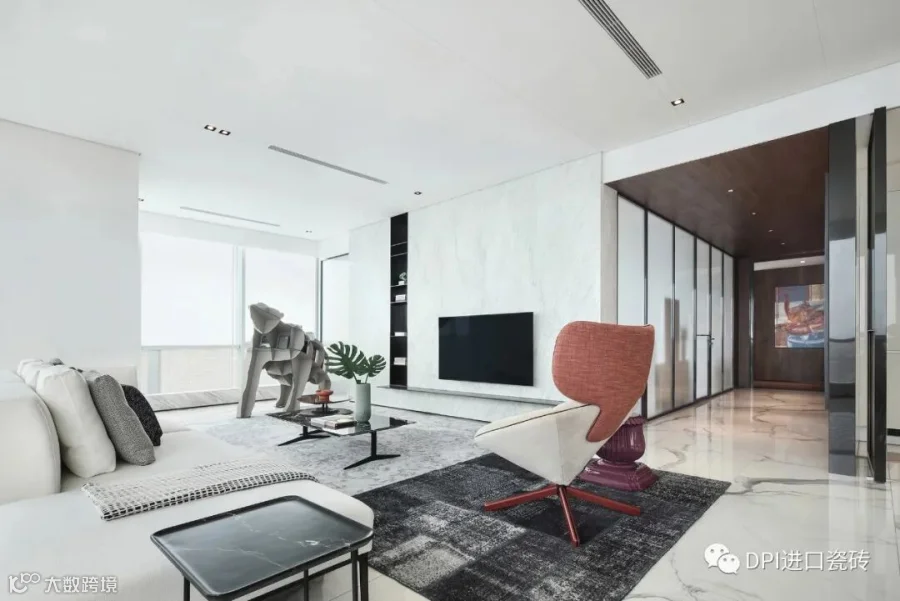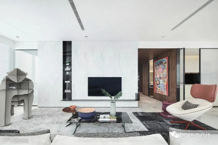 本案运用了REX特级雪花白,源自卡拉卡塔,经典的黑白组合,高贵的白色石纹,纯正的黑色线条,极致和永恒。现代简约的视觉,描绘出沉稳大气又不失温馨舒适的空间感受,没有繁花似锦,唯有灰白刻画的原生之美,缔造了空间永不过时的品味与格调。