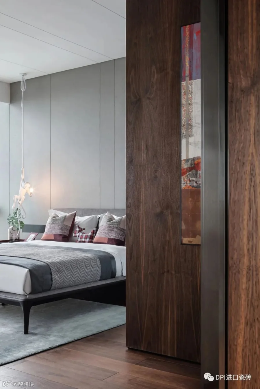 主卧在素雅的背景中,与胡桃木相遇,散发出雅致气息,灰、木两色巧妙配比,让人安享恬静睡眠。立面顺延到顶面的线条造型,呈现不同韵律的分割。雾化玻璃的运用,增强套间内流动性。