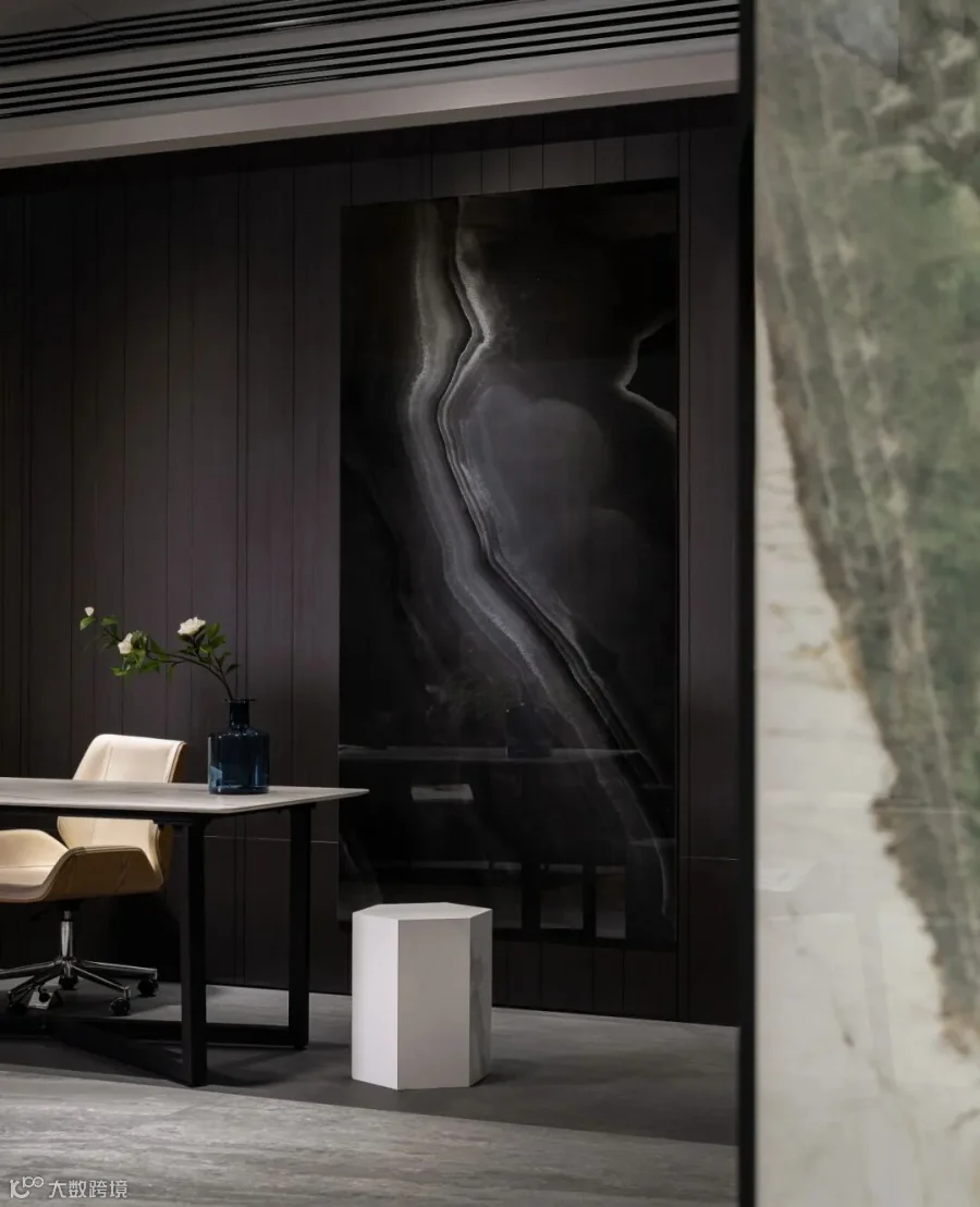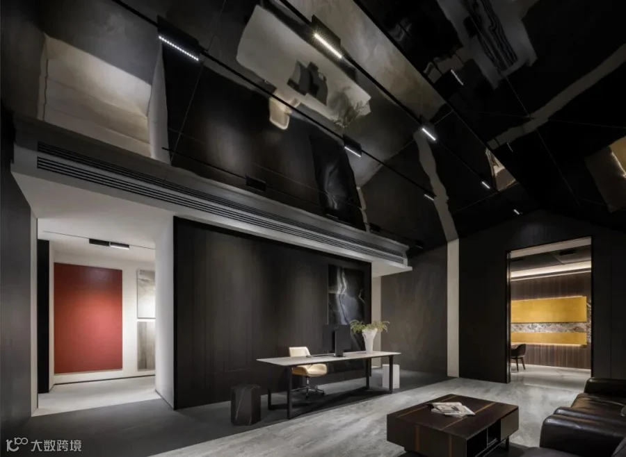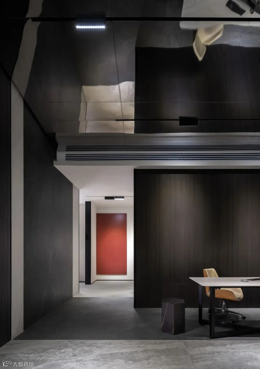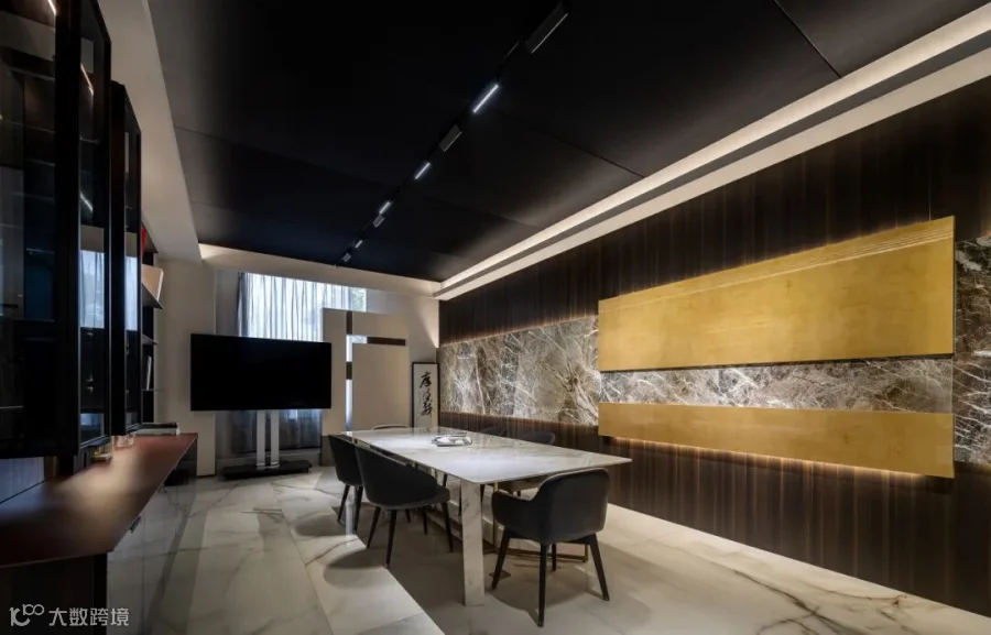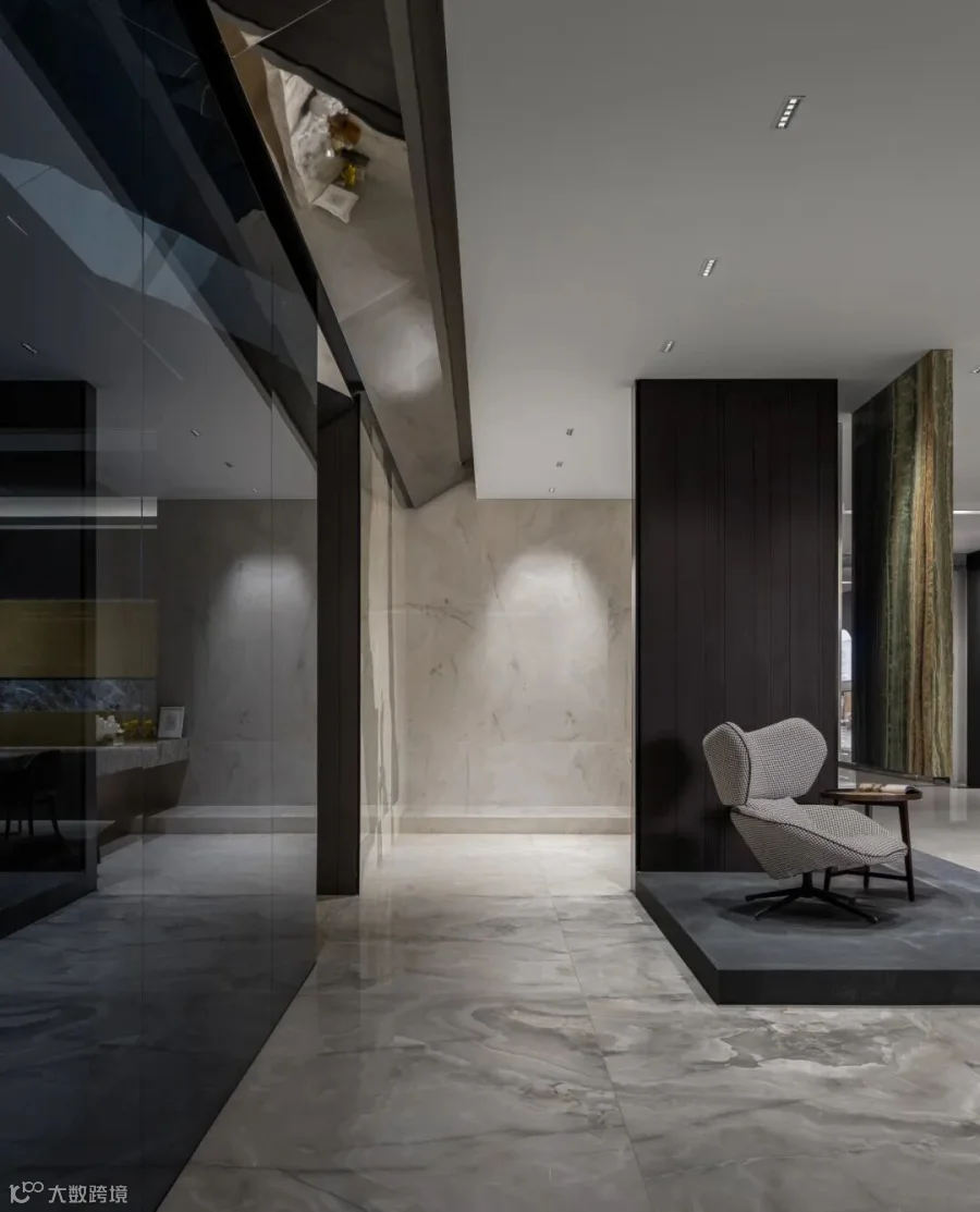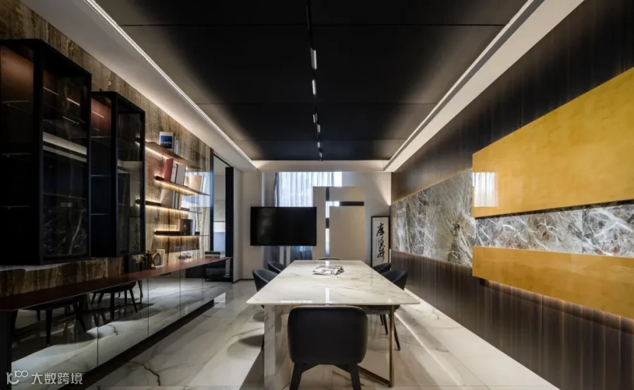 简约的线条宛如灵动的画笔,勾勒出空间的精妙结构关系,疏朗有序的布局如同层叠的山峦,营造出丰富的层次感。在玻璃隔断处运用了透景设计手法,使得光线和视线能在空间中自由流动,从一个空间,延伸至另一个空间,不再是封闭和孤立的。色彩与材质的和谐交融,如同璀璨的星辰,彰显出空间的奢华格调。
