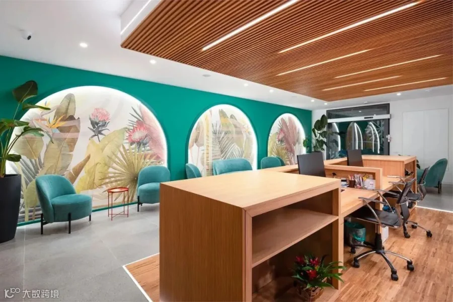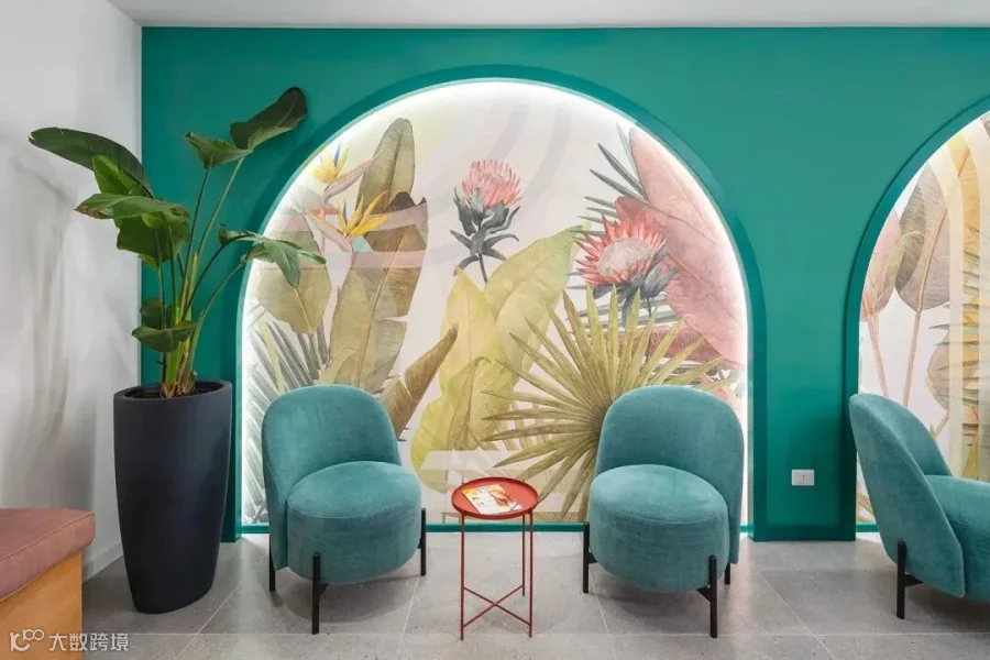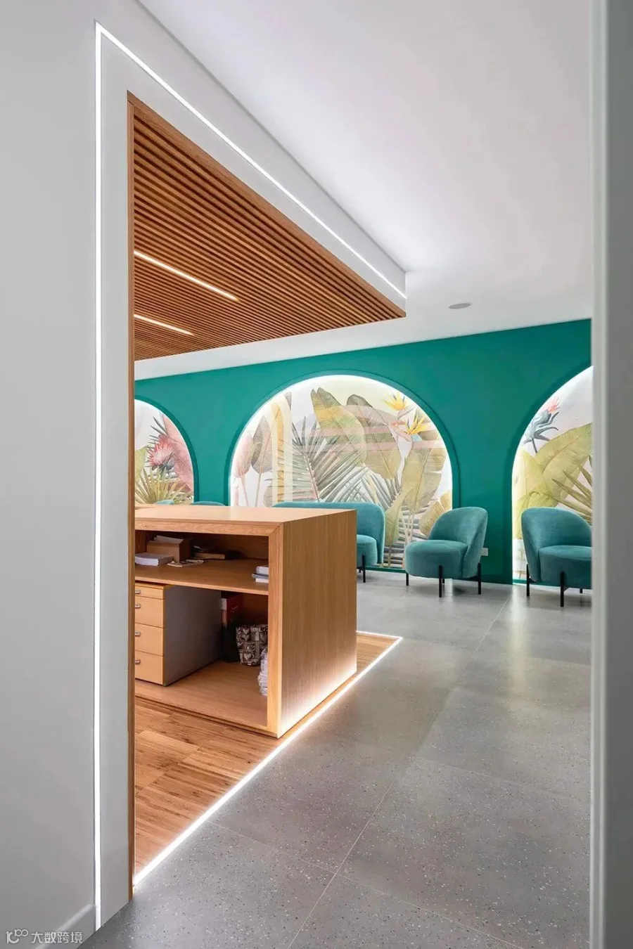 候诊室内摆放了舒适的座椅,整体色调倾向于绿色系。背光拱门的设计巧妙勾勒出墙纸的优美轮廓。接待区主要采用简洁的线条和让人感到温暖的材料,通过墙纸的巧妙运用,实现了现代感与自然元素的完美平衡。