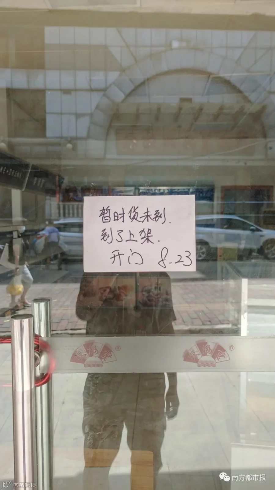 ,记者走访时,店铺尚未开门营业,门口贴有告示称“货品暂时未到,到了上架开门”,店内货架也是空的,没有工作人员在场。