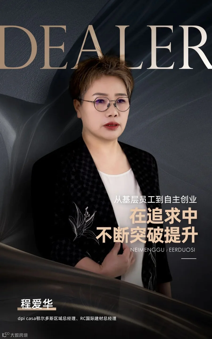 dpi casa鄂尔多斯区域总经理、RC国际建材总经理程爱华女士,以其独特的商业智慧和不懈的创业精神,在经销商队伍中脱颖而出,并成功在新媒体领域塑造了个人IP。本期经销商专访,我们特别邀请到程总来分享她对行业趋势的深刻洞察以及她如何巧妙运用新媒体,将门店经营推向新高度的独到见解。