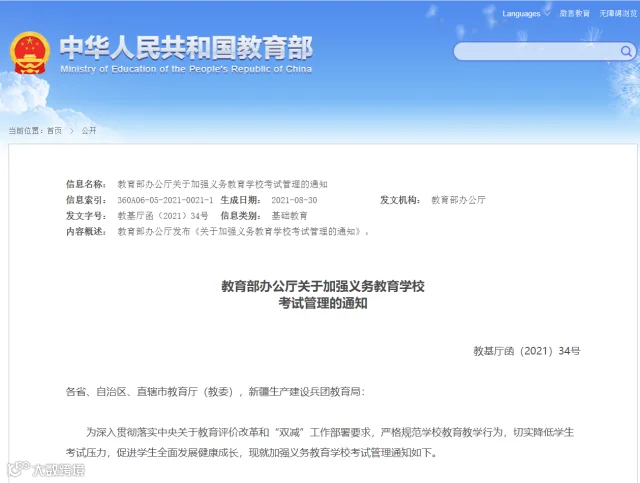 与此同时,教育部办公厅发布关于加强义务教育学校考试管理的通知,对义务教育阶段的考试