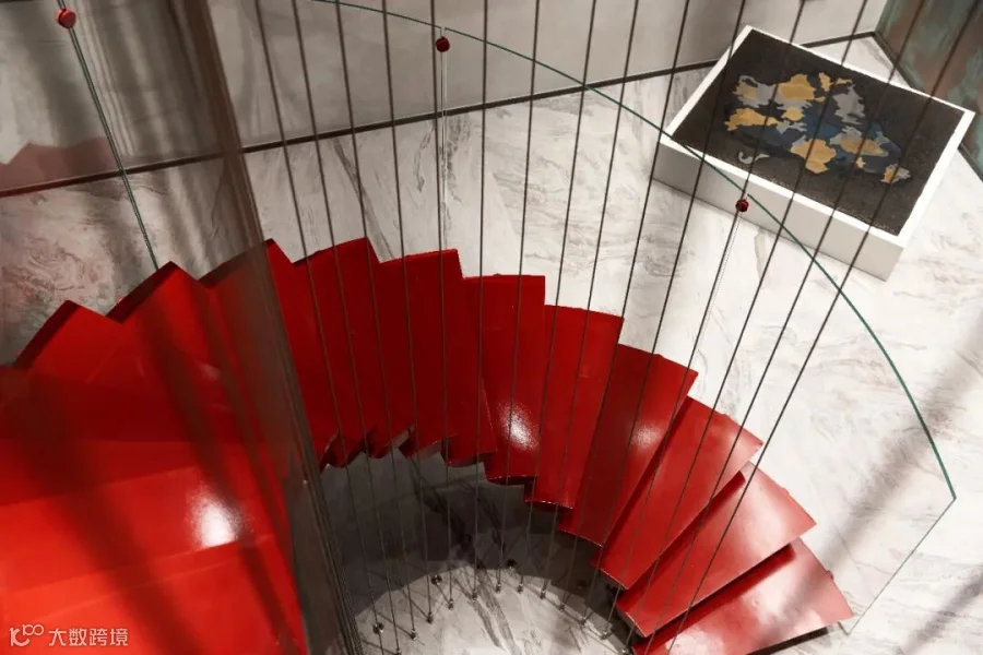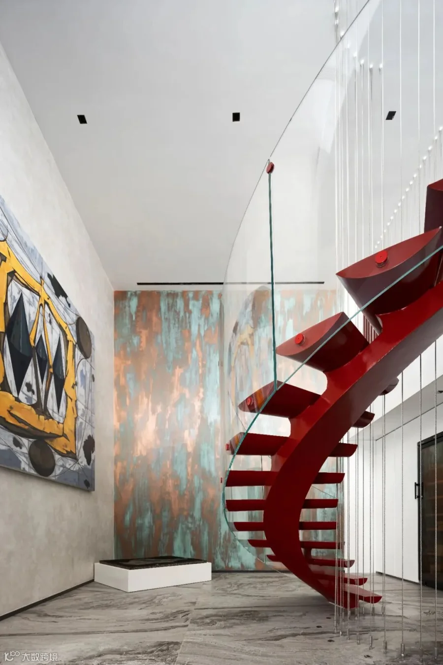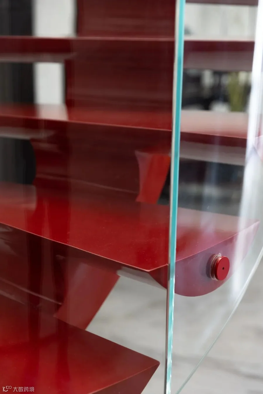 通往地下二层的红色楼梯与白色的波浪铝板背景一样,是空间的建筑精神。这款楼梯完全来自设计师雅雅的原创设计,钢结构与曲面无边框玻璃相结合,玻璃间的红色连接螺丝都是特别定制而成,每一块楼梯踏板在工厂制作完成后现场喷漆打磨安装。