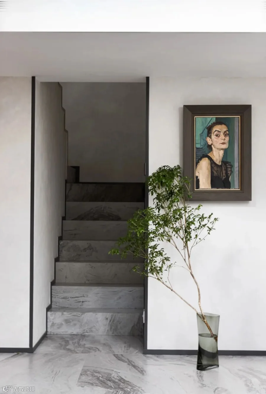 楼梯下的空间是车库入户,也是归家必经之路。整个墙面以艺术涂料刷成钢板的样子,古铜色的金属光泽与绿色的锈迹让这个空间拥有了一些特别的情绪。艺术品成为空间的主角和叙述载体。