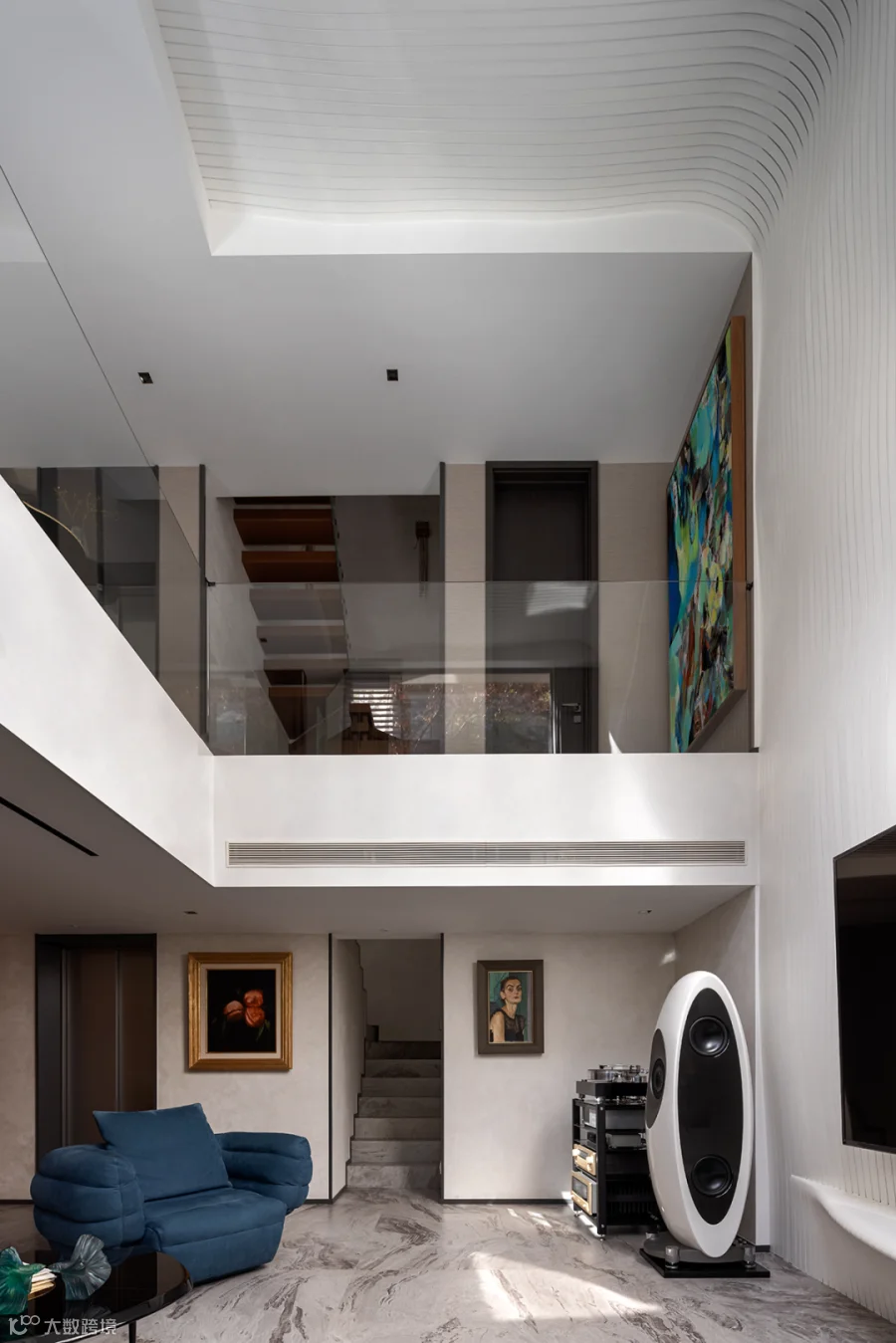 整个地下室的超大挑空和错层为主人创造出类似画廊的氛围感,大面积的墙体为艺术品腾出了更好的展示空间,也为从不同高度和角度欣赏艺术品提供了可能。主人Daisy偏爱当代艺术,收藏了新一代艺术家不同媒介、不同艺术风格的代表性作品,这些穿越时空和主题的艺术品,为主人提供了安放心灵、品味生活的休憩之所。