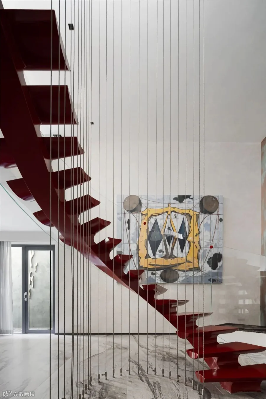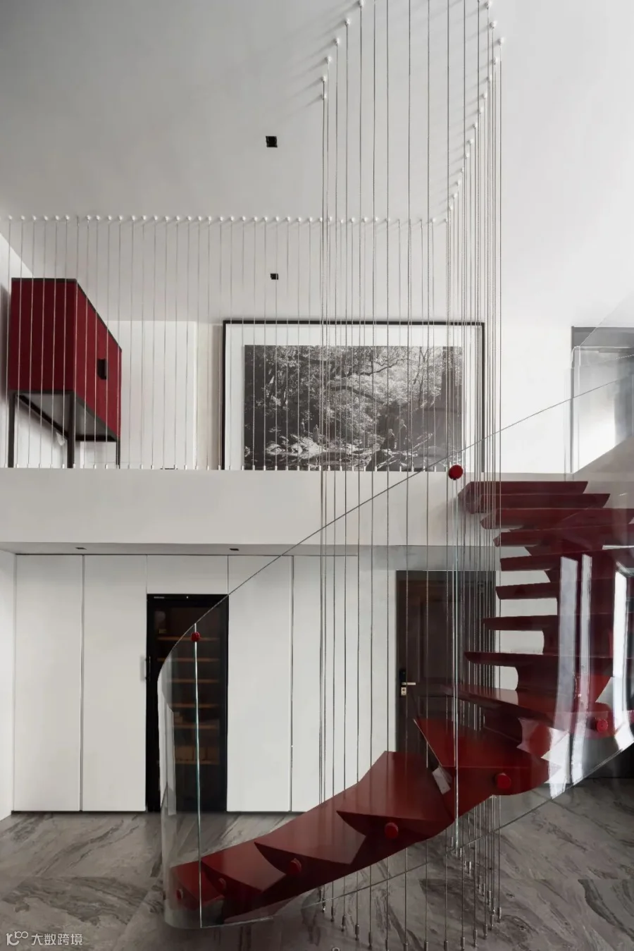 以自上而下的钢丝绳模糊边界,承担了楼梯扶手的作用,跨越空间维度构筑了空间交互对话的关系。