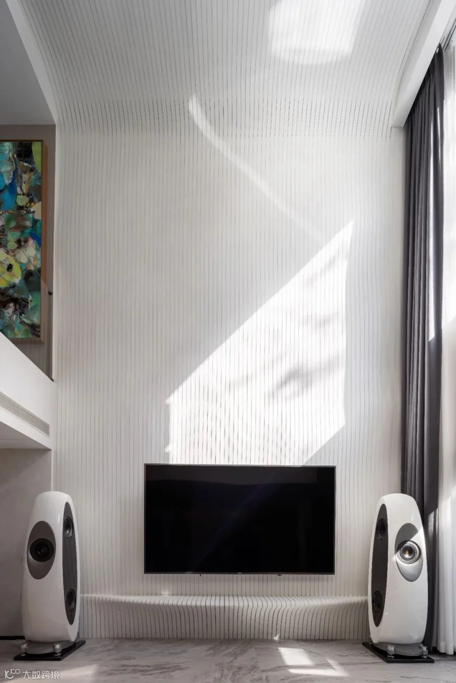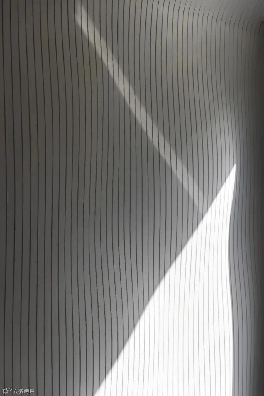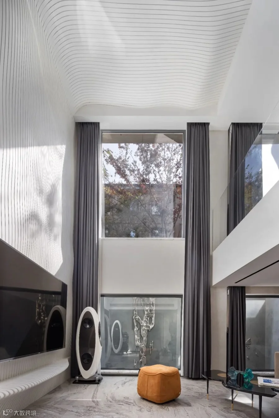 向下挑空的白色背景墙面用竖条纹铝板包裹,从负一层延伸至一层顶面,带有弧度的波浪线有戏剧的张力,自带光芒,沉稳内敛。最大限度的玻璃开窗,将光线毫无保留地引入。当光线在上面不断移动时,树的影子,云朵的影子,都在这个纯净的背景上“演出”。