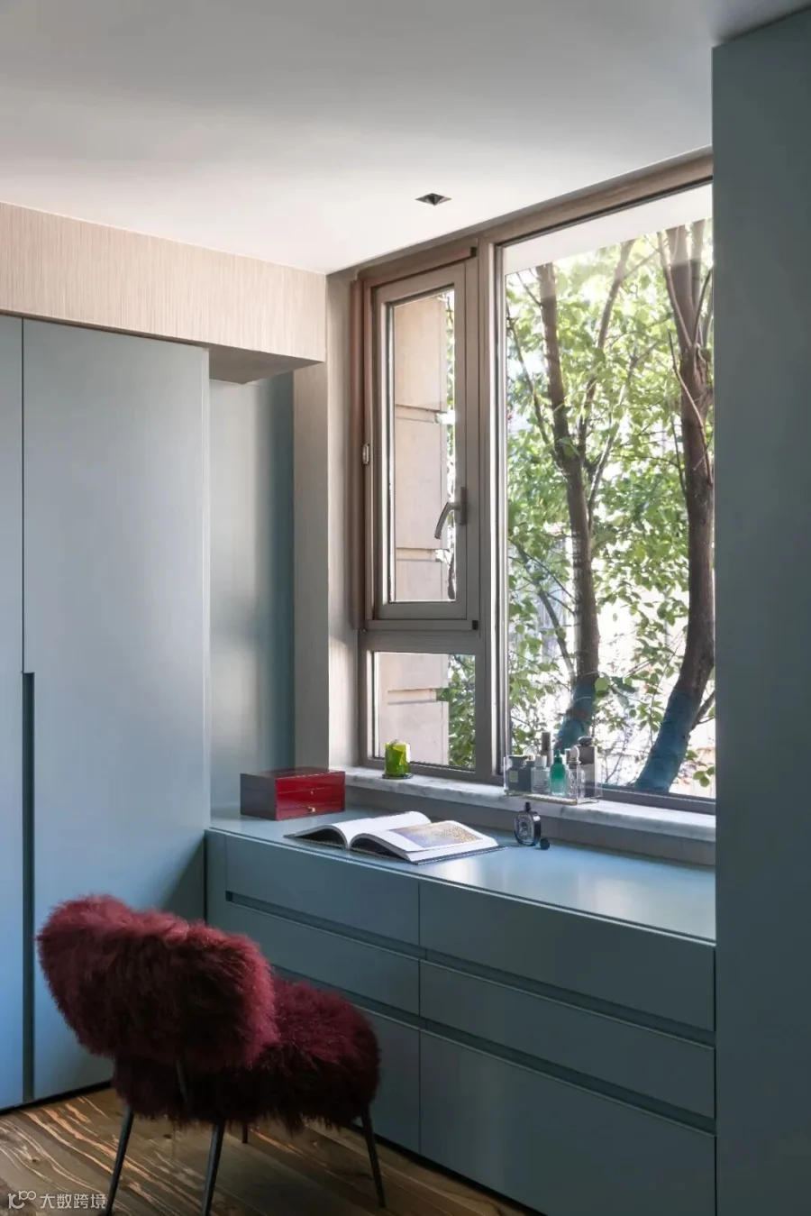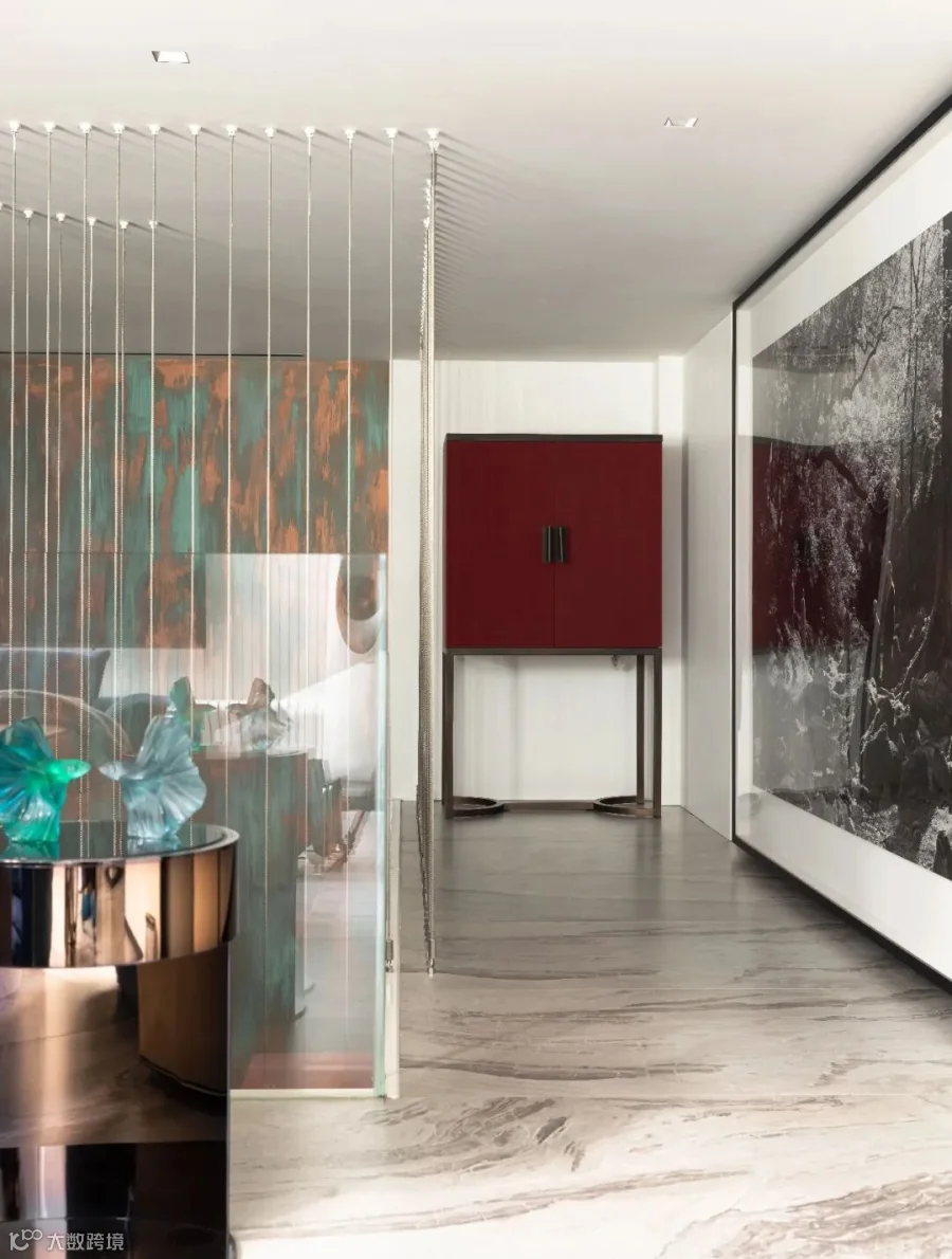 一个红色的中式风格的高柜,成为空间中的亮点,极简的线条与意大利rex法国流金灰的流动的纹理相融合,纯粹的色彩冷暖碰撞,以稳重不失时尚的色调营造不同的景致,彰显着空间层次的变化与细致的美感。