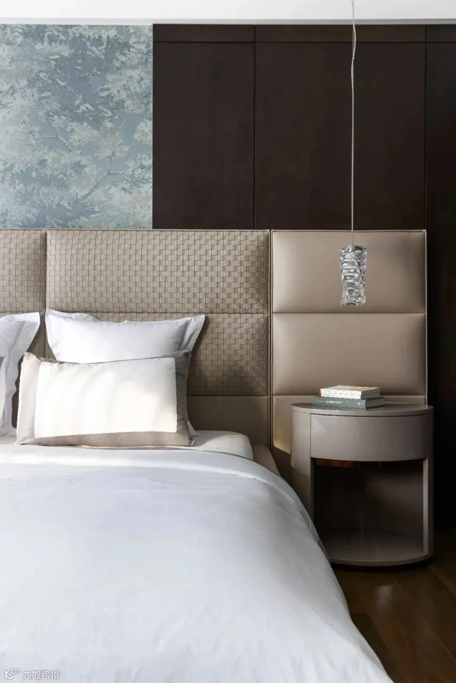 以壁纸与木饰面拼接的方式打造床头背景,舒适的宽背床,以柔软的姿态带来身体的彻底放松,隐形门的设计让空间简洁大气。