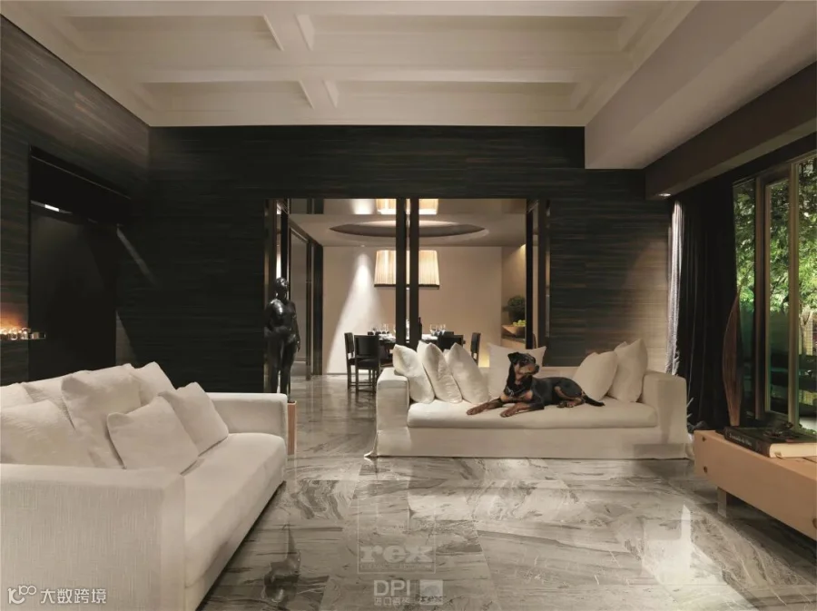 本案选用了REX法国流金灰,源自法国四款稀有的名贵石材,融合五十年代美国迈阿密的移民淘金故事,通过华丽的颜色和大规格的纹理,高贵气质油然而生,空间视野更开阔自然。岁月冲不淡它原有的光彩,心与自然同在,永远都会获得一份宁静,而这种高雅的气质,让生活更显纯粹之美。