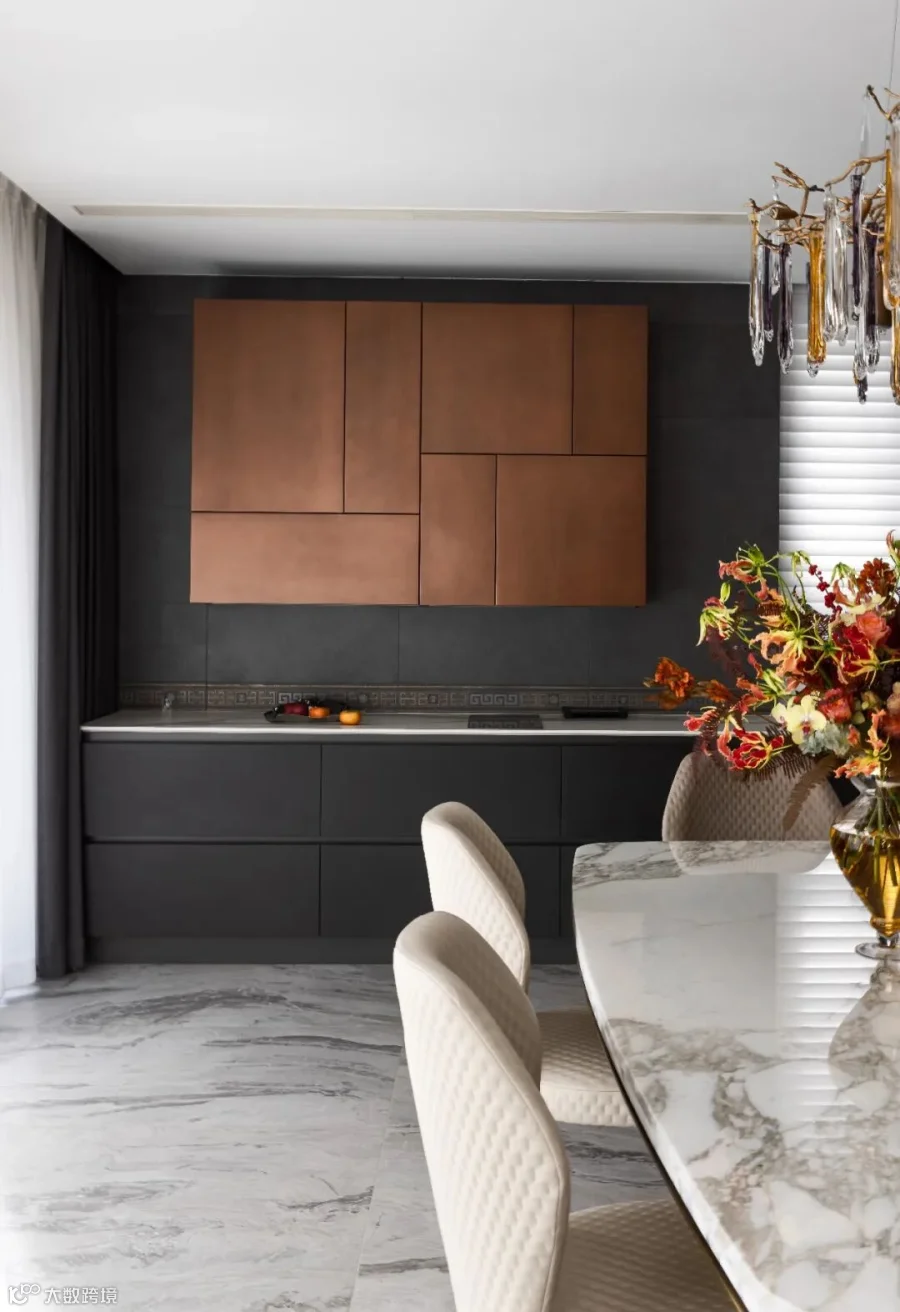 中厨区+西厨区+用餐区构成了尺度奢华的一层空间,设计师希望以物质生活的艺术化为核心去呈现空间,在精神和审美上让一日三餐更值得细细品味。黑色与金属色碰撞,像是低调的绅士。