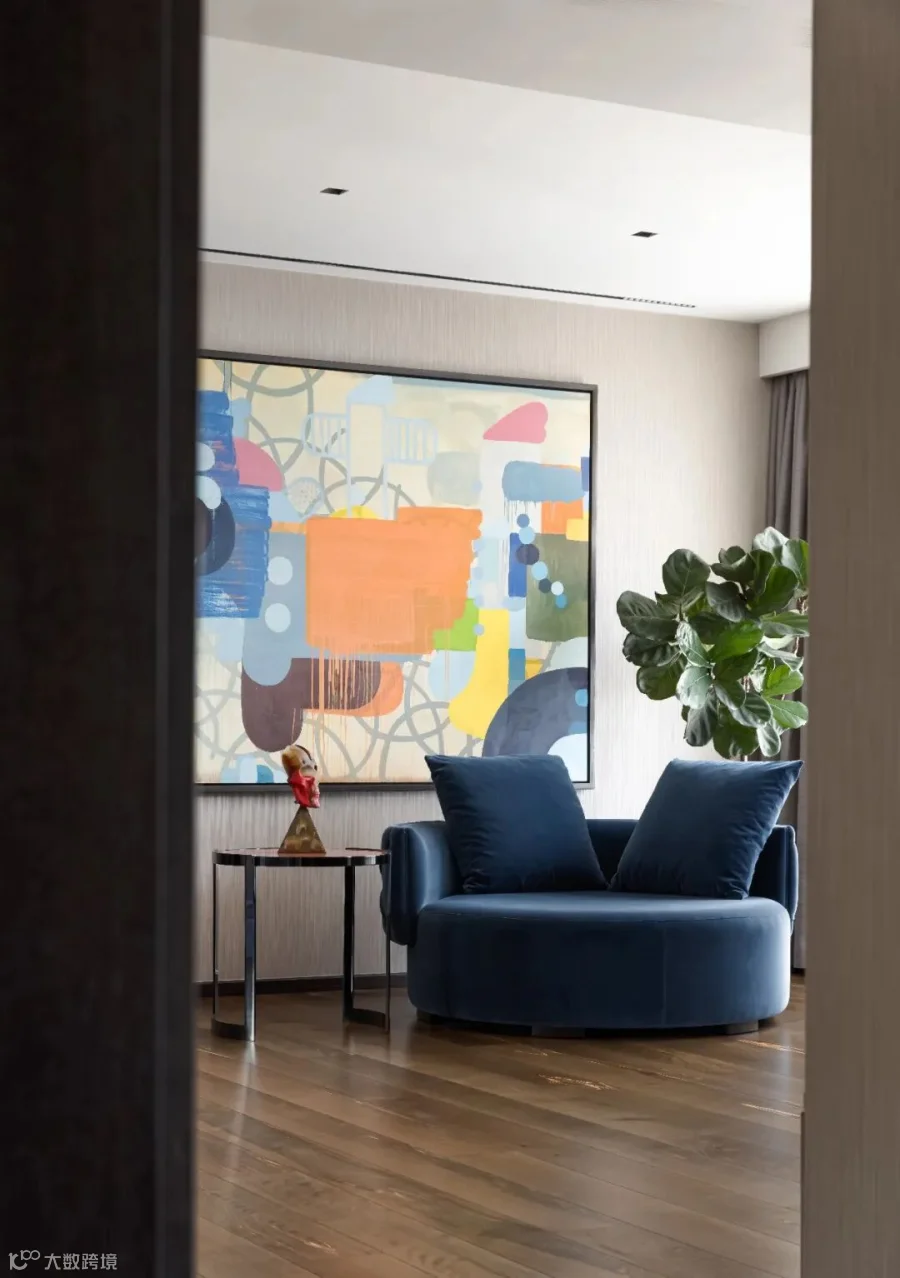 “跟Daisy沟通过程中,感受到他们收藏艺术品源于生活强烈的热爱,希望新家能满足他们对审美情趣和生活舒适度等多方面的需求。因此我在设计的时候,用简练的留白和现代科技为业主打造了一个极具艺术感的空间。”设计师雅雅望着墙上收藏的艺术品说。