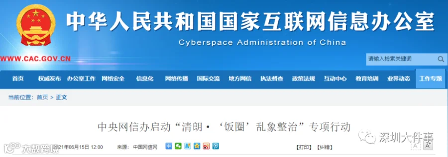 据了解,中央网信办于今年6月决定在全国范围内开展为期2个月的“清朗・‘饭圈’乱象整治”专项行动,重点打击诱导未成年人应援集资、高额消费,粉丝造谣攻击、侵犯隐私等行为。