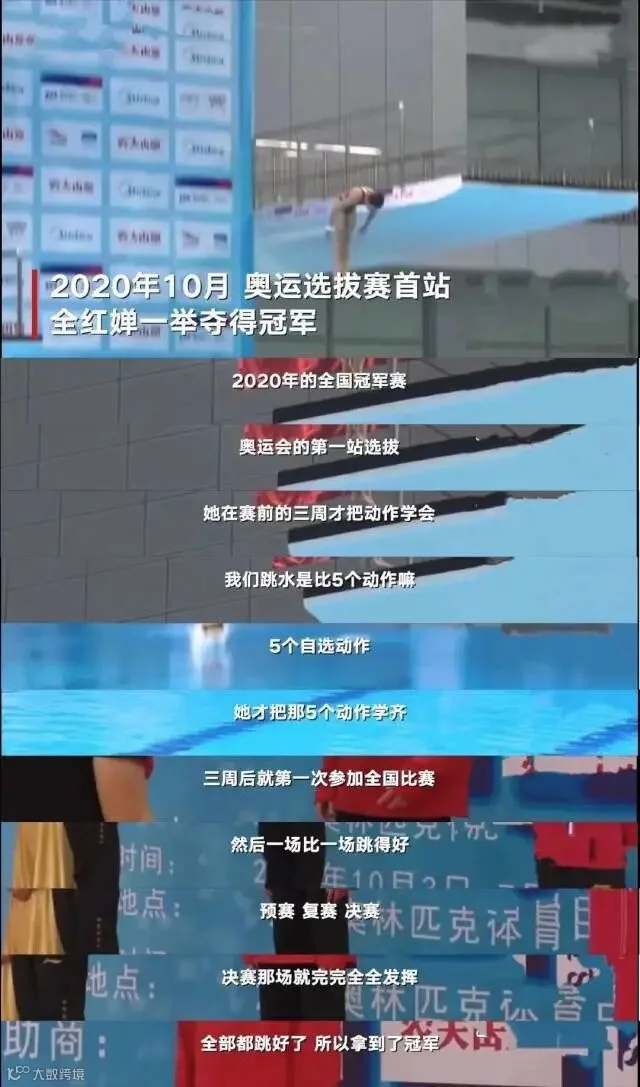 遗憾的是,在赛前的队内测验中,全红婵水平发挥不佳,5个动作的总得分,比奥运会选拔赛时少了将近60分。