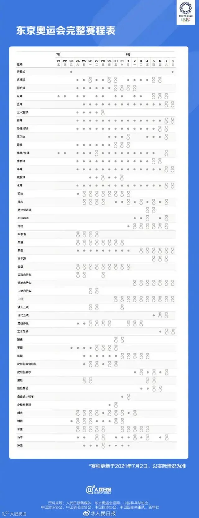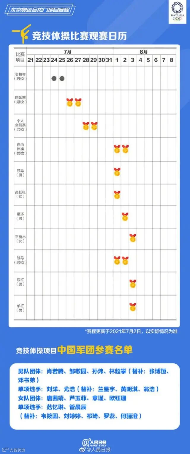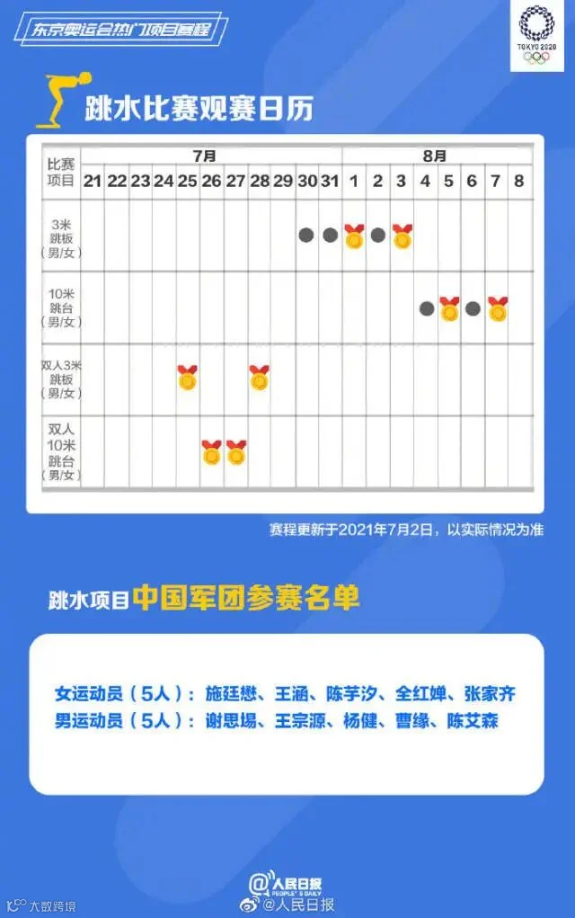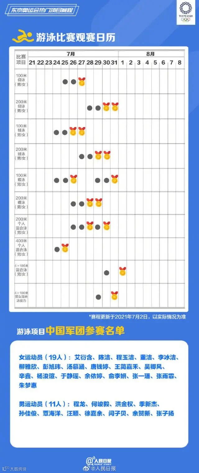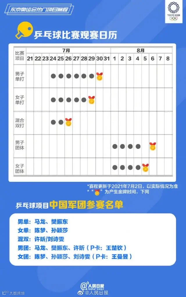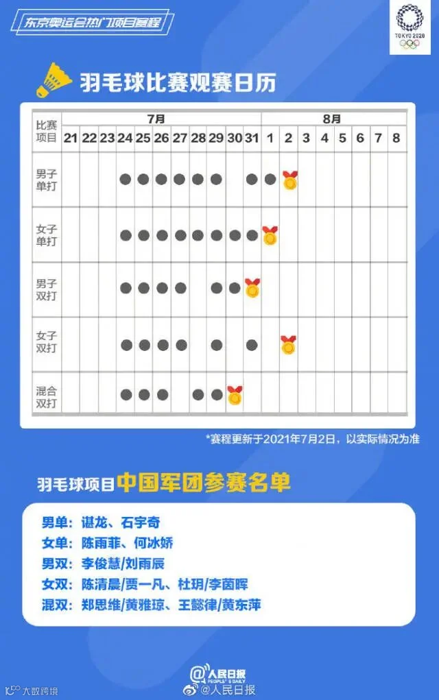 距东京奥运会开幕只剩不到两周,中国多个项目代表队公布奥运名单。乒乓球、羽毛球、跳水、游泳、女排……你关注的比赛什么时候进行?将在哪天产生金牌?有你喜爱的运动员吗?收藏东京奥运会赛程一起看奥运,中国队,加油!