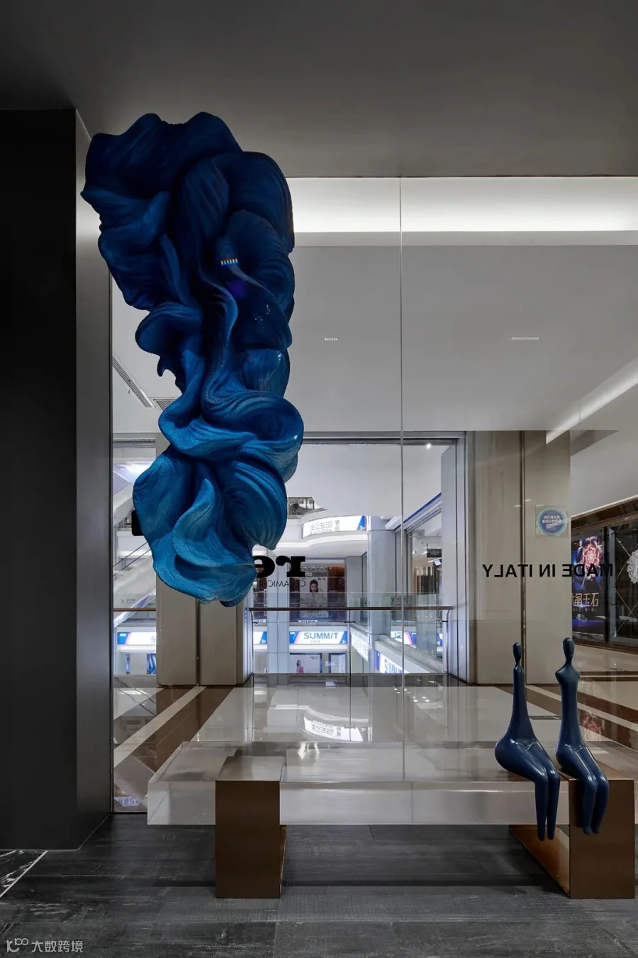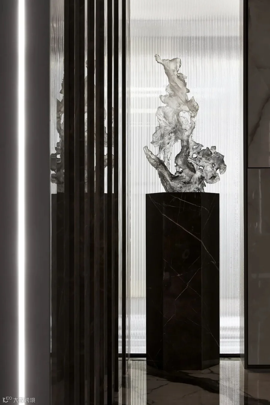 极简的门头造型与独特的瓷砖纹理,形成浓烈对比;硕大且夸张造型的艺术雕塑品,成为空间的点睛之笔,一动一静之间,优雅克制,奢华体验。