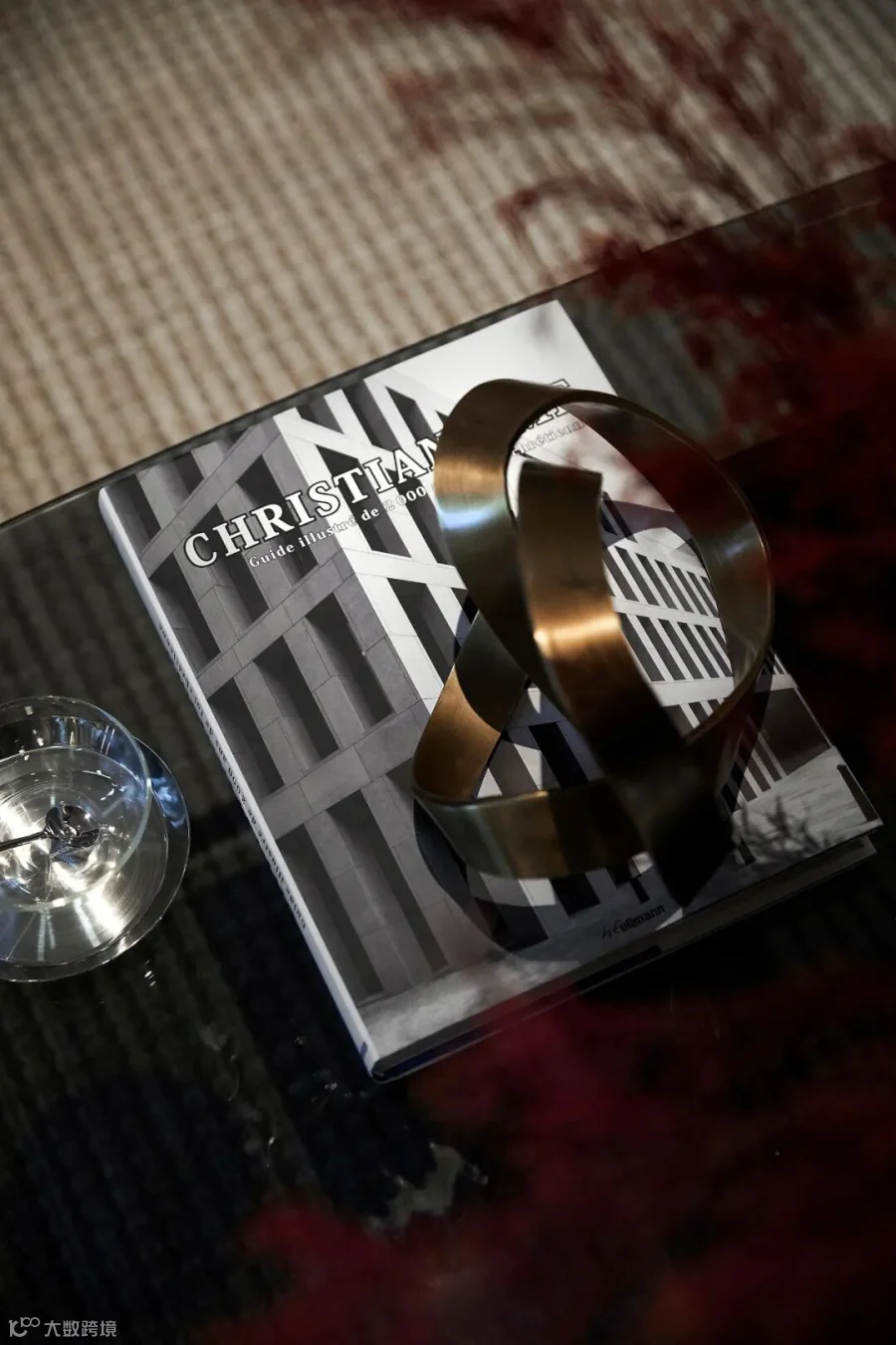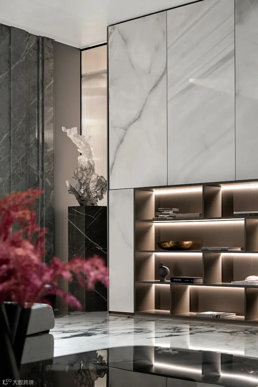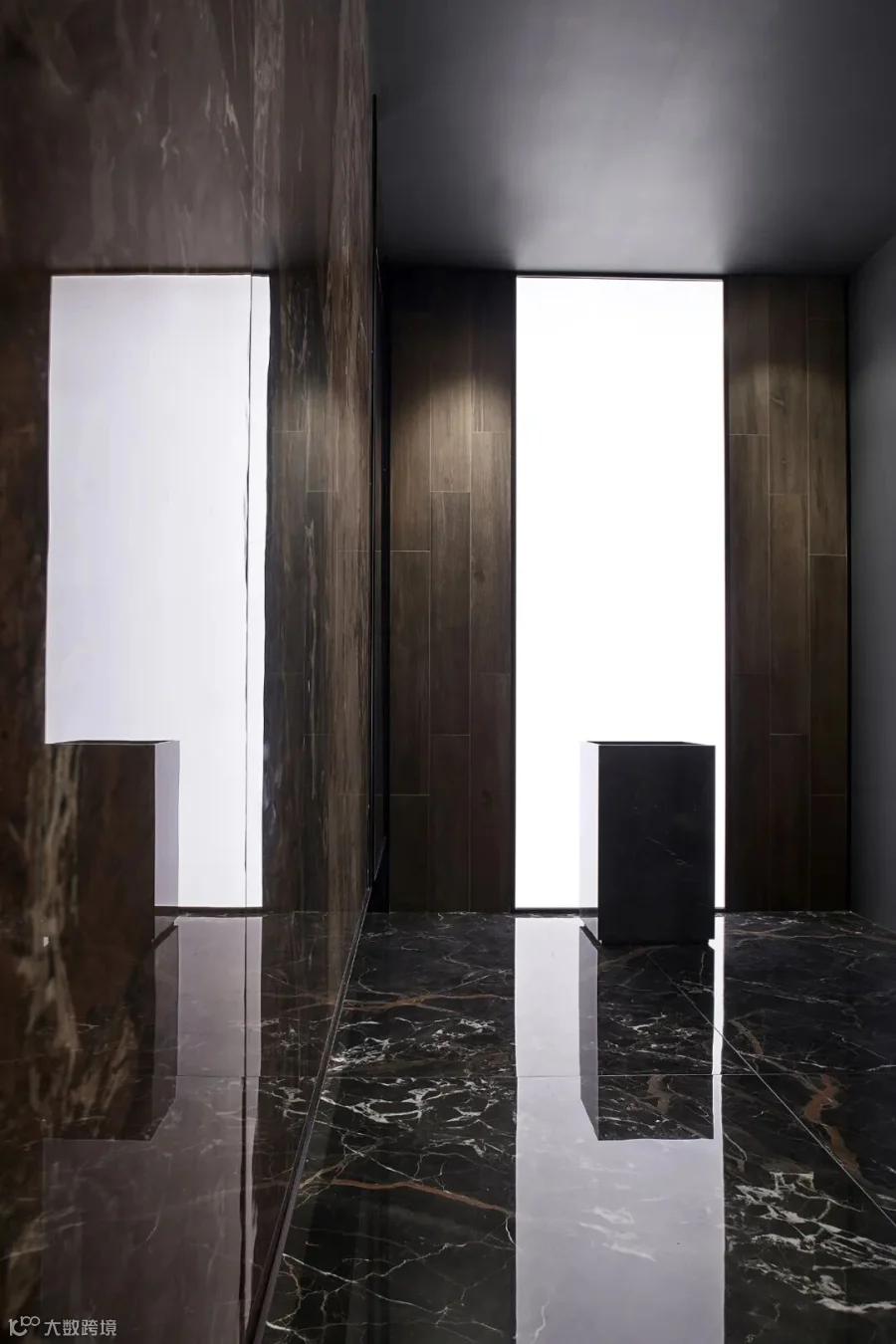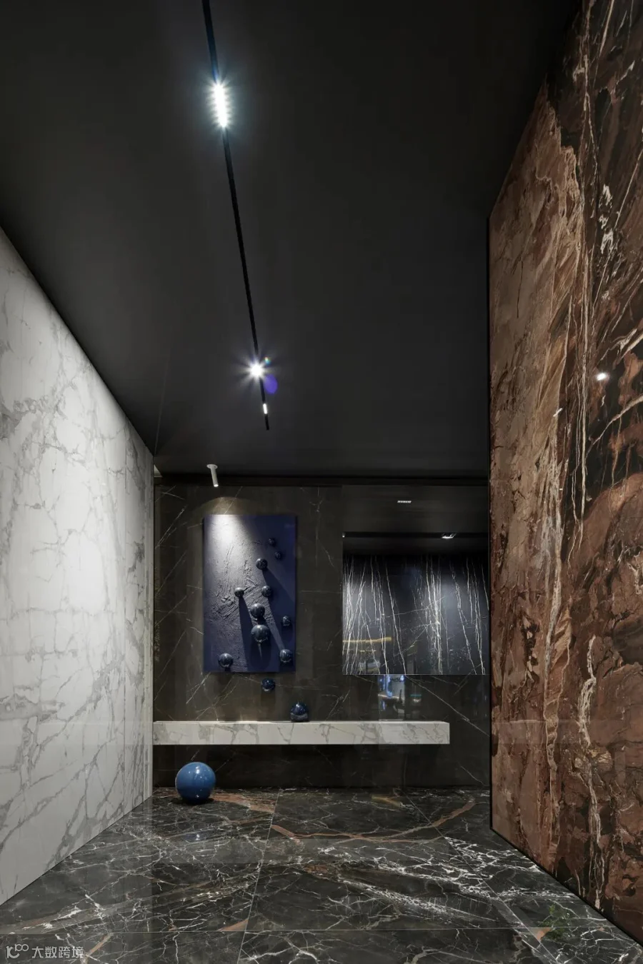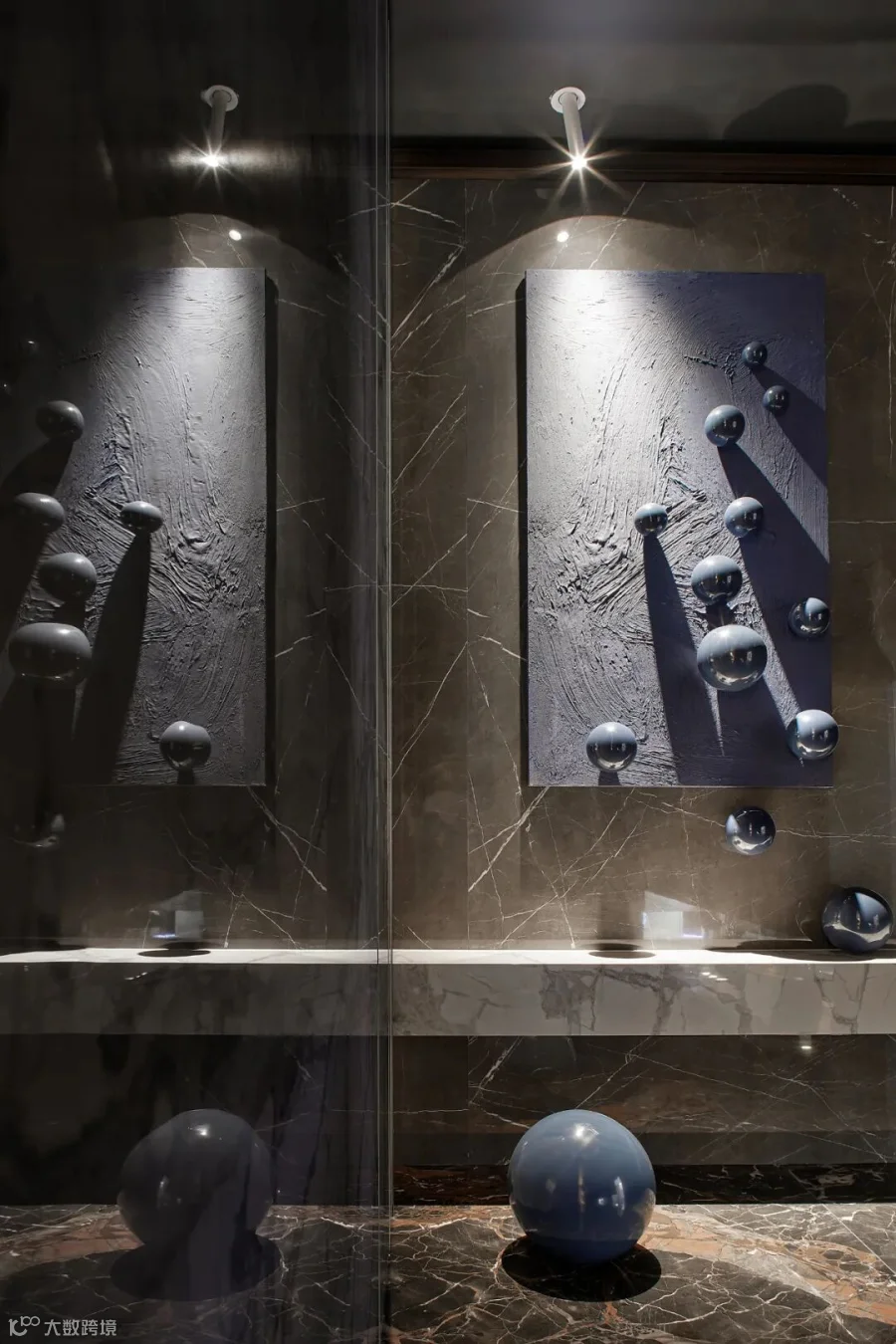 入口呈U型走廊深色空间,意大利REX进口瓷砖延展开去,厚实之感承托起精致现代的艺术陈设,一路上以装置艺术品引导宾客从入口缓缓步入。