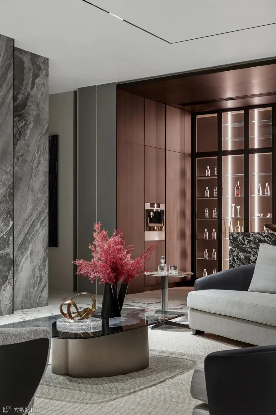在布朗河岩板材质的吧台上,冲一杯升腾的咖啡,香味萦绕在闲适惬意空间中,感受到精致生活的感性与现代时尚生活态度的艺术表达。