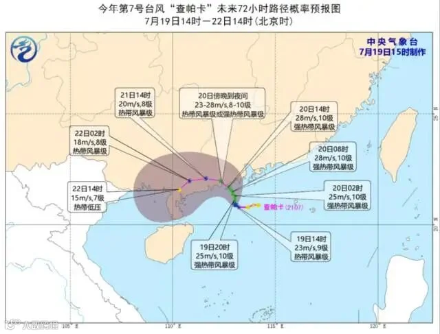 具体到现在的土台风“查帕卡”,截至19日15时15分,台风位于距离广东省阳江市东南方向约140公里处,强度为热带风暴级。
