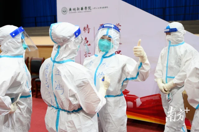 不仅如此,在广东省教育厅牵头、跨地域、跨部门成立的疫情处置专班指导下,广州新华学院成立了“疫情处置学生宿舍管理工作专班”,全面统筹16栋学生宿舍楼在隔离期间学生的服务和管控工作。学校的管理干部、院系辅导员、公安人员、心理专家、院系教师、医护人员、宿管等,由楼长组织运转工作,分三班轮值,每班10人,确保对隔离学生的24小时生命、健康和心理守护。